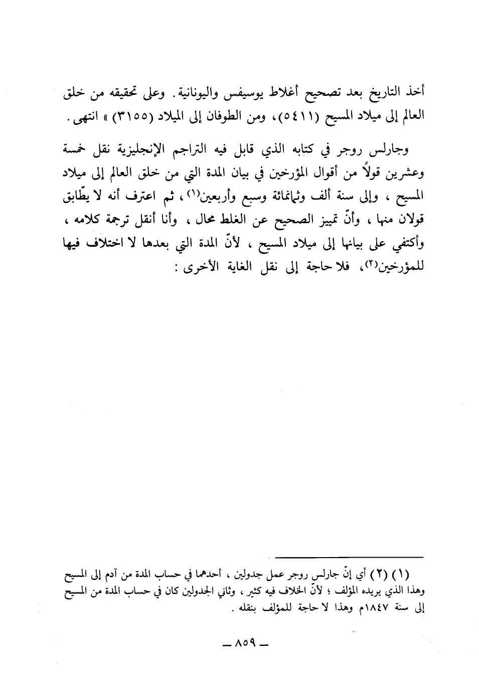 أخذ التاريخ بعد تصحيح أغلاط يوسيفس واليونانية وعلى تحقيقه من خلق العالم إلى ميلاد المسيح [5411] ومن الطوفان إلى الميلاد [3155] انتهى. وجارلس روجر في كتابه الذي قابل فيه التراجم الإنجليزية نقل خمسة وعشرين قولاً من أقوال المؤرخين في بيان المدة التي من خلق العالم إلى ميلاد المسيح وإلى سنة ألف وثمانمائة وسبع وأربعين، ثم اعترف أنه لا يطابق قولان منها أو أن تمييز الصحيح عن الغلط محال، وأنا أنقل ترجمة كلامه وأكتفي ببيانها إلى ميلاد المسيح لأن المدة التي بعدها لا اختلاف فيها للمؤرخين فلا حاجة إلى نقل الغاية الأخرى.