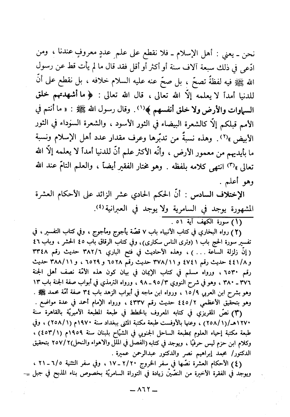 نحن - يعني أهل الإسلام - فلا نقطع على علم عدد معروف عندنا ومن ادعى في ذلك سبعة آلاف سنة أو أكثر أو أقل، فقد قال ما لم يأت قط عن رسول الله صلى الله عليه وسلم فيه لفظة تصح عنه عليه السلام خلافه، بل نقطع على أن للدنيا أمداً لا يعلمه إلا الله تعالى قال الله تعالى: {ما أشهدتهم خلق السماوات والأرض ولا خلق أنفسهم} وقال رسول الله صلى الله عليه وسلم: (ما أنتم في الأمم قبلكم إلا كالشعرة البيضاء في الثور الأسود أو الشعرة السوداء في الثور الأبيض) ، وهذه نسبة من تدبرها وعرف مقدار عدد أهل الإسلام ونسبة ما بأيديهم من معمور الأرض وأنه الأكثر علم أن للدنيا أمداً لا يعلمه إلا الله تعالى) انتهى كلامه بلفظه، وهو مختار الفقير أيضاً والعلم التام عند الله وهو أعلم.