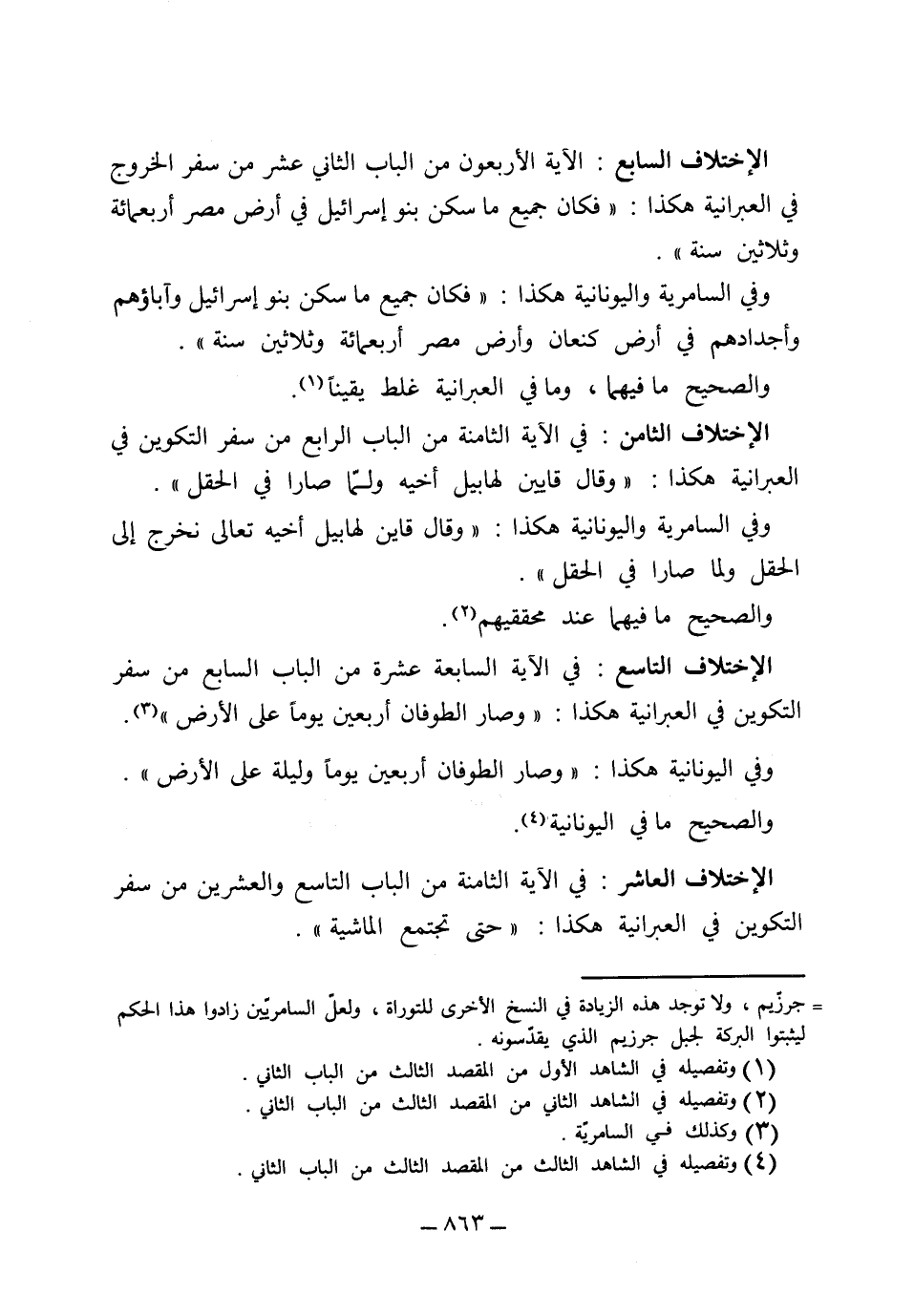 (الاختلاف السابع) الآية الأربعون من الباب الثاني عشر من سفر الخروج في العبرانية هكذا: (فكان جميع ما سكن بنو إسرائيل في أرض مصر أربعمائة وثلاثين سنة) وفي السامرية واليونانية هكذا: (فكان جميع ما سكن بنو إسرائيل وآباؤهم وأجدادهم في أرض كنعان وأرض مصر أربعمائة وثلاثين سنة) والصحيح ما فيهما وما في العبرانية غلط يقيناً. (الاختلاف الثامن) في الآية الثامنة من الباب الرابع من سفر التكوين في العبرانية هكذا: (وقال قائين لهابيل أخيه ولما صار في الحقل) وفي السامرية واليونانية هكذا: (وقال قائين لهابيل أخيه تعال نخرج إلى الحقل ولما صارا في الحقل) والصحيح ما فيهما عند محققيهم. (الاختلاف التاسع) في الآية السابعة عشرة من الباب السابع من سفر التكوين في العبرانية هكذا: (وصار الطوفان أربعين يوماً على الأرض) . وفي اليونانية هكذا: (وصار الطوفان أربعين يوماً وليلة على الأرض) والصحيح ما في اليونانية. (الاختلاف العاشر) في الآية الثامنة من الباب التاسع والعشرين من سفر التكوين في العبرانية هكذا: (حتى تجتمع الماشية) .