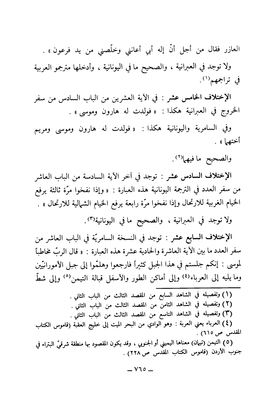 العازار فقال من أجل أن إله أبي أعانني وخلصني من سيف فرعون) ولا توجد في العبرانية، والصحيح ما في اليونانية وأدخلها مترجمو العربية في تراجمهم. (الاختلاف الخامس عشر) في الآية العشرين من الباب السادس من سفر الخروج في العبرانية هكذا: (فولدت له هارون وموسى) وفي السامرية واليونانية هكذا: (فولدت له هارون وموسى ومريم أختهما) والصحيح ما فيهما. (الاختلاف السادس عشر) توجد في آخر الآية السادسة من الباب العاشر من سفر العدد في الترجمة اليونانية هذه العبارة: (وإذا نفخوا مرة ثالثة ترفع الخيام الغربية للارتحال، وإذا نفخوا مرة رابعة ترفع الخيام الشمالية للارتحال) ولا توجد في العبرانية والصحيح ما في اليونانية.