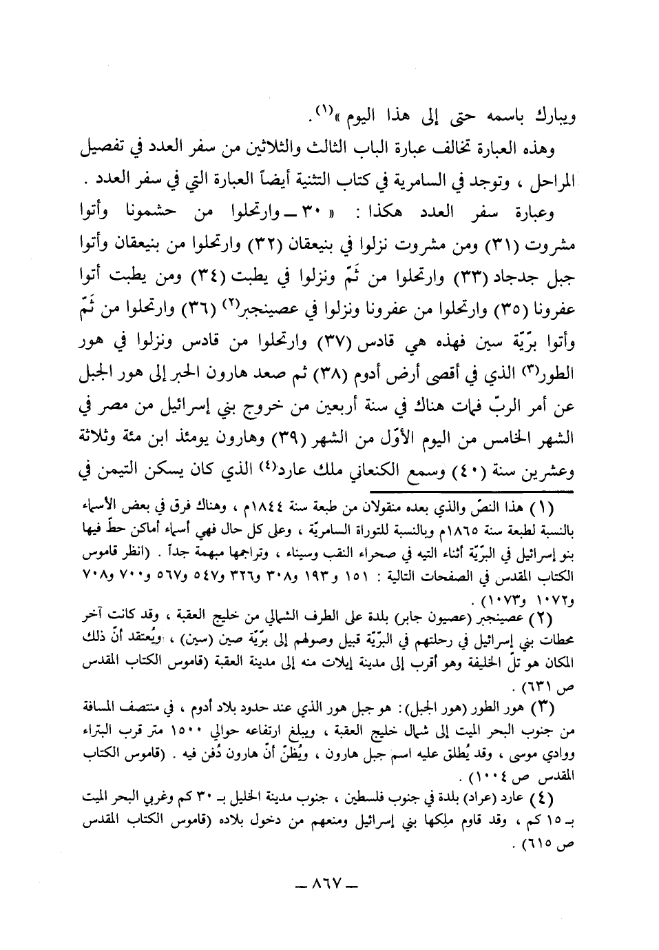 وهذه العبارة تخالف عبارة الباب الثالث والثلاثين من سفر العدد في تفصيل المراحل. وتوجد في السامرية في كتاب الاستثناء أيضاً العبارة التي في سفر العدد وعبارة سفر العدد هكذا: 30: (وارتحلوا من حشمونا وأتوا مشروت) 31: (ومن مشروت نزلوا في بني عقان) 32: (وارتحلوا من بني عقان وأتوا جبل جد جاد) 33: (وارتحلوا من ثم ونزلوا في يطبث) 34: (ومن يطبث أتوا عفرونا) 35: (وارتحلوا من عفرونا ونزلوا في عصينجير) 36: (وارتحلوا من ثم وأتوا برية سين، فهذه هي قادس) 37: (وارتحلوا من قادس في هور الطور الذي في أقصى أرض أدوم) 38: (ثم صعد هارون الحبر إلى هور الجبل عن أمر الرب فمات هناك في سنة أربعين من خروج بني إسرائيل من مصر في الشهر الخامس في اليوم الأول من الشهر) 39: (وهارون يومئذ ابن مائة وثلاث وعشرون سنة) 40: (وسمع الكنعاني ملك غارد الذي كان يسكن التيمن