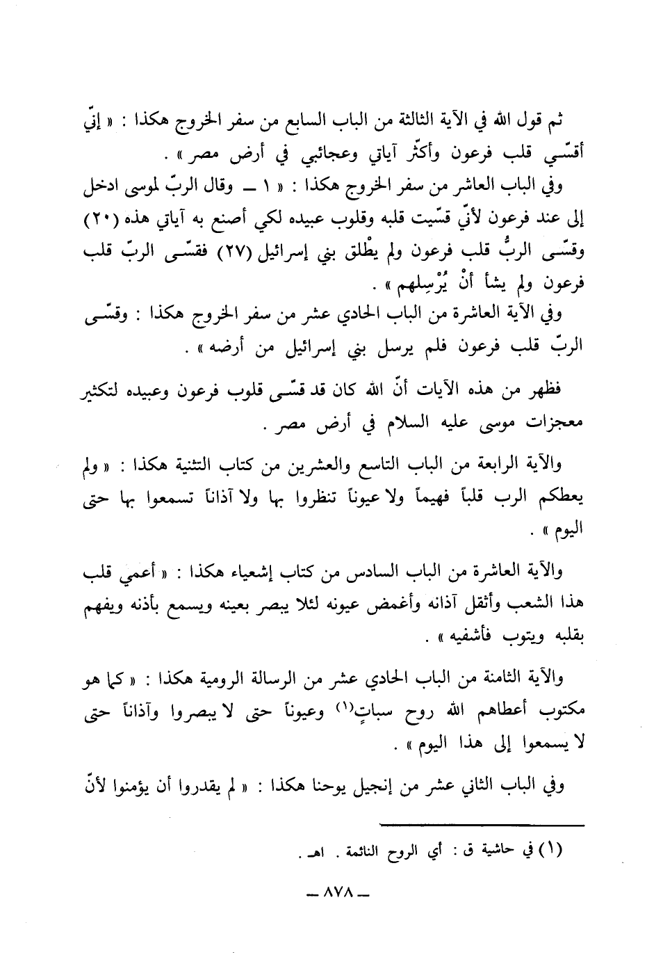ثم قول الله في الآية الثالثة من الباب السابع من سفر الخروج هكذا: (إني أقسي قلب فرعون وأكثر آياتي وعجائبي في أرض مصر) وفي الباب العاشر من سفر الخروج هكذا: 1: (وقال الرب لموسى ادخل عند فرعون لأني قسيت قلبه وقلوب عبيده لكي أصنع به آياتي هذه) 20: (وقسى الرب قلب فرعون ولم يطلق بني إسرائيل) 27: (فقسى الرب قلب فرعون ولم يشأ أن يرسلهم) وفي الآية العاشرة من الباب الحادي عشر من سفر الخروج هكذا: (وقسى الرب قلب فرعون فلم يرسل بني إسرائيل من أرضه) فظهر من هذه الآيات أن الله كان قد قسى قلوب فرعون وعبيده لتكثير معجزات موسى عليه السلام في أرض مصر.