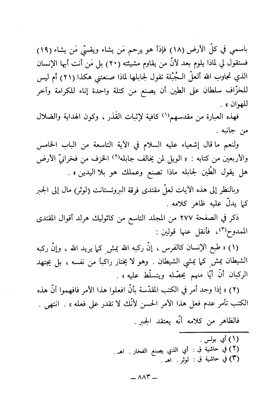 ولنعم ما قال أشعيا عليه السلام في الآية التاسعة من الباب الخامس والأربعين من كتابه: (الويل لمن يخالف جابلة خزف من خزاف الأرض هل يقول الطين لجابله ماذا تصنع هل يقول عملك ليس اليدان لك) وبالنظر إلى هذه الآيات لعل مقتدى فرقة بروتستنت لو طرمال إلى الجبر كما يدل عليه ظاهر كلامه ذكر في الصفحة 277 من المجلد التاسع من كاثلك هرلد أقوال المقتدى الممدوح فأنقل عنها قولين: 1 (طبع الإنسان كالفرس إن ركبه الله يمشي كما يريد وإن ركبه الشيطان يمشي كما يمشي الشيطان، وهو لا يختار راكباً من نفسه بل يجتهد الركبان أن أياً منهم يحصله ويتسلط عليه) 2 (إذا وجد أمر في الكتب المقدسة بأن افعلوا هذا الأمر فافهموا أن هذه الكتب تأمر عدم فعل هذا الأمر الحسن لأنك لا تقدر على فعله) انتهى. فالظاهر من كلامه أنه يعتقد الجبر.