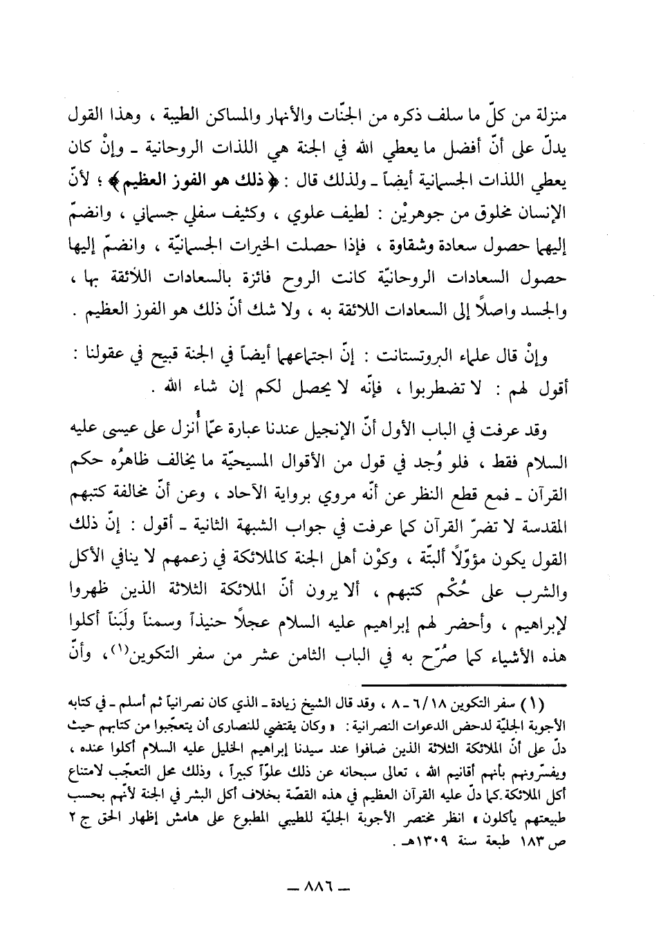 منزلة من كل ما سلف ذكره من الجنات والأنهار والمساكن الطيبة وهذا القول يدل على أن أفضل ما يعطي الله في الجنة هي اللذات الروحانية وإن كان يعطي اللذات الجسمانية أيضاً. ولذلك قال ذلك هو الفوز العظيم، لأن الإنسان مخلوق من جوهرين لطيف علوي وكثيف سفلي جسماني، وانضم إليهما حصول سعادة وشقاوة، فإذا حصلت الخيرات الجسمانية وانضم إليها حصول السعادات الروحانية، كان الروح فائزاً بالسعادات اللائقة به والجسد واصلاً إلى السعادات اللائقة به، ولا شك أن ذلك هو الفوز العظيم، وإن قال علماء بروتستنت إن اجتماعهما أيضاً في الجنة قبيح في عقولنا. أقول لهم لا تضطربوا فإنه لا يحصل لكم إن شاء الله، وقد عرفت في الباب الأول أن الإنجيل عندنا عبارة عما أنزل على عيسى عليه السلام فقط، فلو وجد في قول من الأقوال المسيحية ما يخالف ظاهره حكم القرآن، فمع قطع النظر عن أنه مروي برواية الآحاد، وعن أن مخالفة كتبهم المقدسة لا تضر القرآن، كما عرفت في جواب الشبهة الثانية.