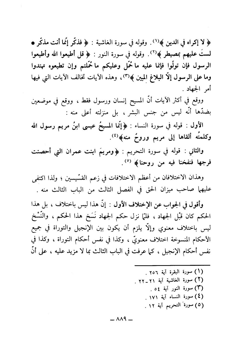 يوجد في القرآن الاختلافات المعنوية مثلاً، قوله: {لا إكراه في الدين} وقوله في سورة الغاشية: {فذكر إنما أنت مذكر لست عليهم بمسيطر} وقوله في سورة النور: {قل أطيعوا الله وأطيعوا الرسول فإن تولوا فإنما عليه ما حُمّل وعليكم ما حُمِّلتم وإن تطيعوه تهتدوا وما على الرسول إلا البلاغ المبين} . وهذه الآيات تخالف الآيات التي فيها أمر الجهاد. ووقع في أكثر الآيات أن المسيح إنسان ورسول فقط، ووقع في موضع بضدها أنه ليس من جنس البشر بل منزلته أعلى منه. الأول قوله في سورة النساء: {إنما المسيح عيسى ابن مريم رسول الله وكلمته ألقاها إلى مريم وروح منه} والثاني قوله في سورة التحريم: {ومريم ابنة عمران التي أحصنت فرجها فنفخنا فيه من روحنا} وهذان الاختلافان من أعظم الاختلافات في زعم القسيسين ولذا اكتفى عليهما صاحب ميزان الحق في الفصل الثالث من الباب الثالث منه. (وأقول) في الجواب عن الاختلاف الأول أن هذا ليس باختلاف، بل هذا الحكم كان قبل الجهاد فلما نزل حكم الجهاد نسخ هذا الحكم، والنسخ ليس باختلاف معنوي وإلا يلزم أن يكون بين الإنجيل والتوراة في جميع الأحكام المنسوخة اختلاف معنوي، وكذا في نفس أحكام التوراة وكذا في نفس أحكام الإنجيل كما عرفت في الباب الثالث بما لا مزيد عليه، على أن