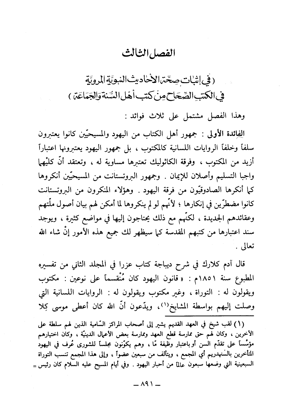 (الفائدة الأولى) جمهور أهل الكتاب من اليهود والمسيحيين كانوا يعتبرون سلفاً وخلفاً الروايات اللسانية كالمكتوب، بل جمهور اليهود يعتبرونها اعتباراً أزيد من المكتوب، وفرقة كتلك تعتبرها مساوية له وتعتقد أن كليهما واجبا التسليم وأصلان للإيمان وجمهور بروتستنت من المسيحيين أنكروها كما أنكرها الصادوقيون من فرقة اليهود، وهؤلاء المنكرون من بروتستنت كانوا مضطرين في إنكارها، لأنهم لو لم ينكروها لما أمكن لهم بيان أصول ملتهم وعقائدهم الجديدة، لكنهم مع ذلك يحتاجون إليها في مواضع كثيرة ويوجد سند اعتبارها من كتبهم المقدسة، كما سيظهر لك جميع هذه الأمور إن شاء الله تعالى.