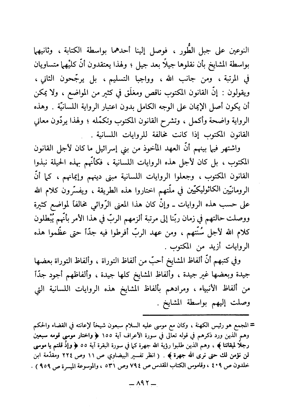 النوعين على جبل الطور فوصل إلينا أحدهما بواسطة الكتابة وثانيهما بواسطة المشايخ بأن نقلوها جيلاً بعد جيل، ولهذا يعتقدون أن كليهما مساويان في المرتبة ومن جانب الله وواجبا التسليم، بل يرجحون الثاني ويقولون إن القانون المكتوب ناقص مغلق في كثير من المواضع، ولا يمكن أن يكون أصل الإيمان على الوجه الكامل بدون اعتبار الرواية اللسانية، وهذه الرواية واضحة وأكمل، وتشرح القانون المكتوب وتكمله، ولهذا يردون معاني القانون المكتوب إذا كانت مخالفة للروايات اللسانية، واشتهر فيما بينهم أن العهد المأخوذ من بني إسرائيل ما كان لأجل القانون المكتوب، بل كان لأجل هذه الروايات اللسانية، فكأنهم بهذه الحيلة نبذوا القانون المكتوب وجعلوا الروايات اللسانية مبنى دينهم وإيمانهم، كما أن الرومانيين الكاتوليكيين في ملتهم اختاروا هذه الطريقة ويفسرون كلام الله على حسب هذه الروايات، وإن كان هذا المعنى الروايتي مخالفاً لمواضع كثيرة، ووصلت حالتهم في زمان ربنا إلى مرتبة ألزمهم الرب في هذا الأمر بأنهم يبطلون كلام الله لأجل سنتهم، ومن عهد الرب أفرطوا فيه جداً حتى عظموا هذه الروايات أزيد من المكتوب. وفي كتبهم أن ألفاظ المشايخ أحب من ألفاظ التوراة وألفاظ التوراة بعضها جيدة وبعضها غير جيدة، وألفاظ المشايخ كلها جيدة، وألفاظهم أجود جداً من ألفاظ الأنبياء.