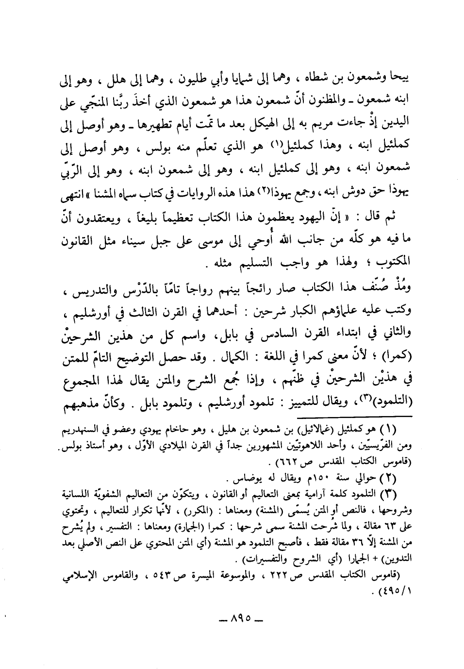 (ثم قال إن اليهود يعظمون هذا الكتاب تعظيماً بليغاً ويعتقدون أن ما فيه هو كله من جانب الله أوحى إلى موسى على جبل سيناء مثل القانون المكتوب ولهذا هو واجب التسليم مثله ومنذ صنف هذا الكتاب صار رائجاً بينهم رواجاً تاماً بالدرس والتدريس، وكتب عليه علماؤهم الكبار شرحين أحدهما في القرن الثالث في أورشليم والثاني في ابتداء القرن السادس في بابل واسم كل من هذين الشرحين كمرالان، معنى كمرا في اللغة الكمال، وقد حصل التوضيح التام للمتن في هذين الشرحين في ظنهم وإذا جمع الشرح والمتن يقال لهذا المجموع طالموت ويقال للتمييز طالموت أورشليم وطالموت بابل، وكان مذهبهم