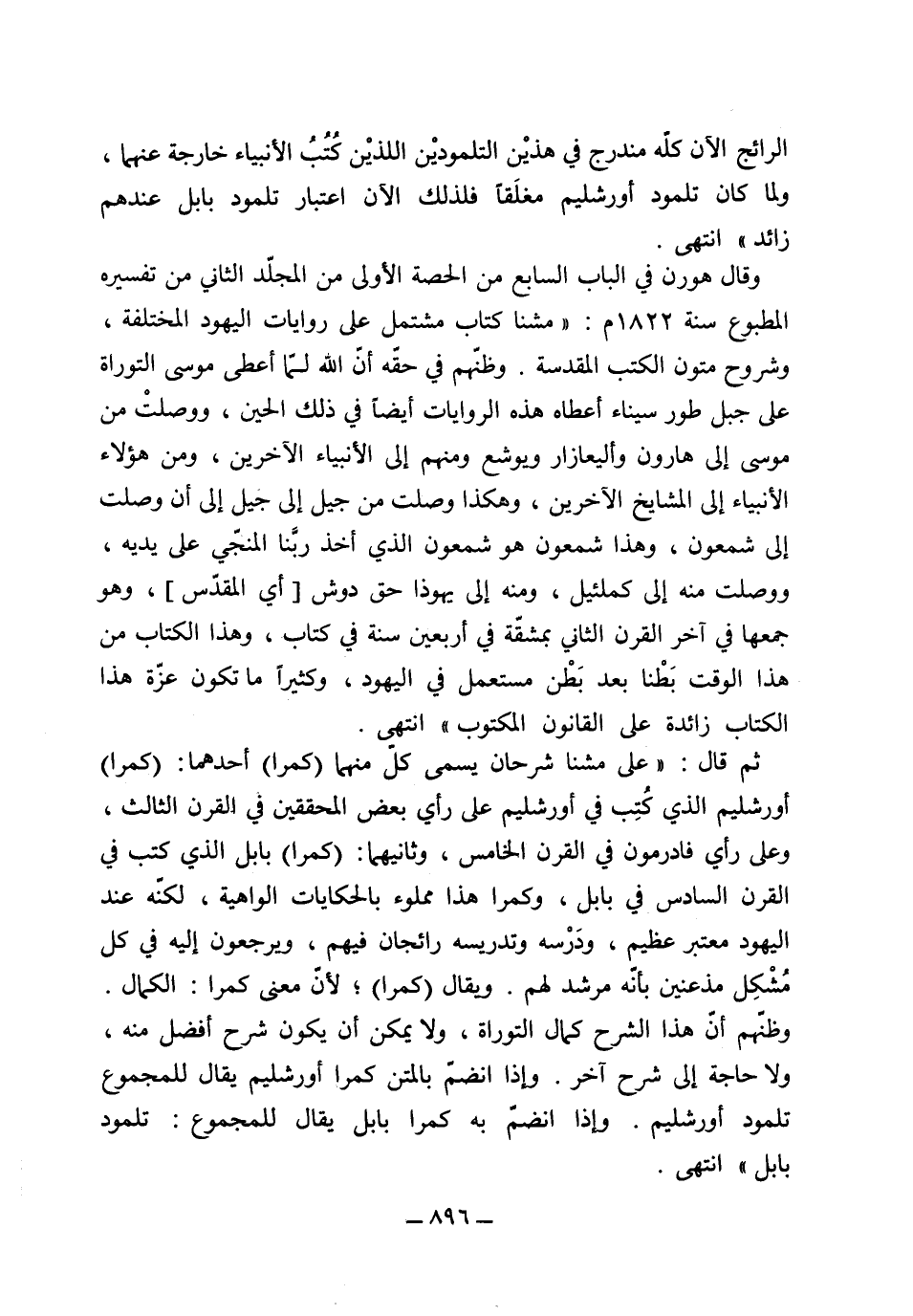 (ثم قال على مسنا شرحان يسمى كل منهما كمرا أحدهما كمر أورشليم الذي كتب في أورشليم على رأي بعض المحققين في القرن الثالث وعلى رأي فادرمون في القرن الخامس والثاني كمرا بابل الذي كتب في القرن السادس في بابل، وكمرا هذا مملوء بالحكايات الواهية لكنه عند اليهود معتبر عظيم ودرسه وتدريسه رائجان فيهم، ويرجعون إليه في كل مشكل مذعنين بأنه مرشد لهم، ويقال كمرا لأن معنى كمرا الكمال، وظنهم أن هذا الشرح كمال التوراة ولا يمكن أن يكون شرح أفضل منه، ولا حاجة إلى شرح آخر، وإذا انضم بالمتن كمرا أورشليم يقال للمجموع طالموت أورشليم وإذا انضم به كمرا بابل يقال للمجموع طالموت بابل)