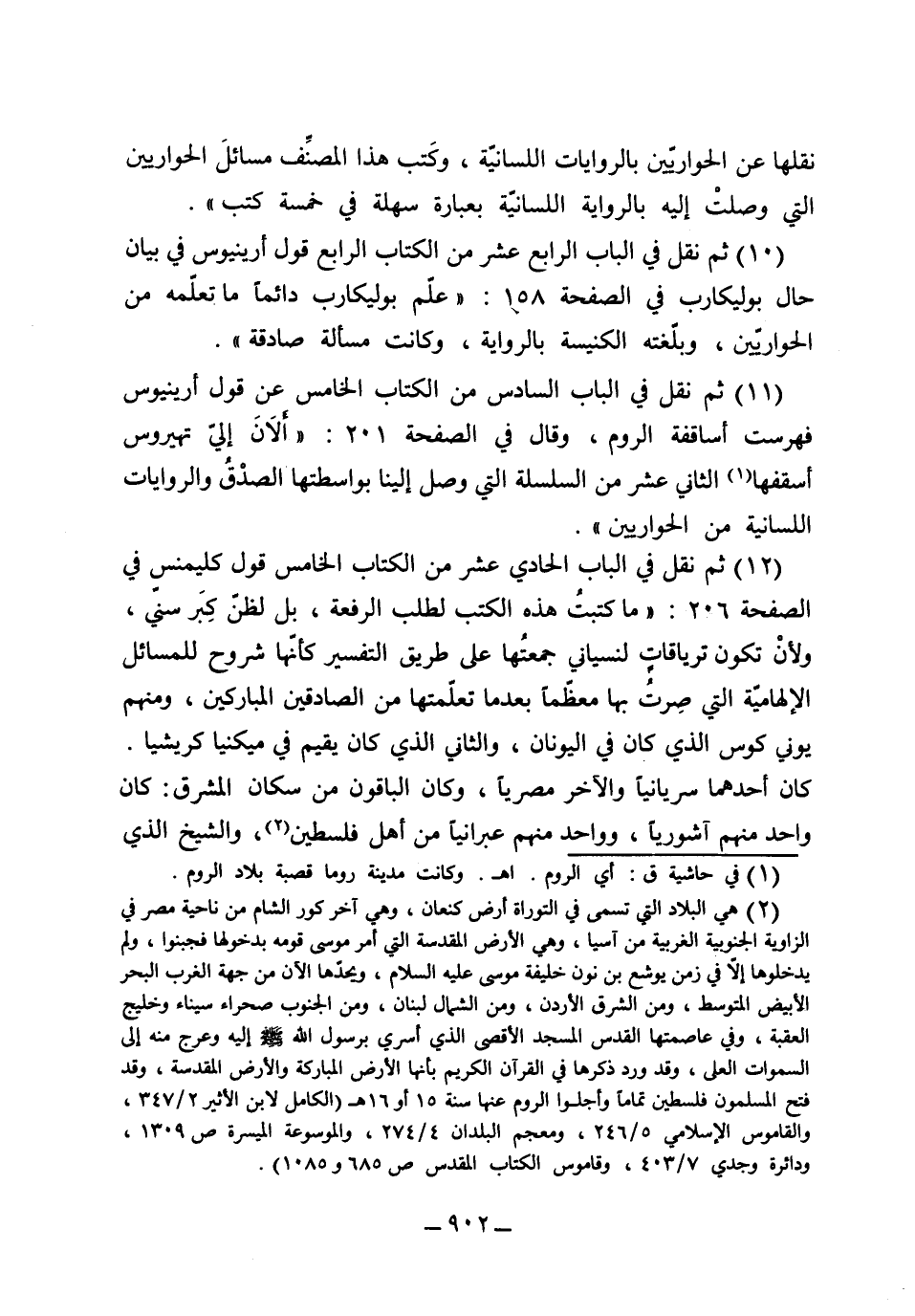 نقلها عن الحواريين بالروايات اللسانية وكتب هذا المصنف مسائل الحواريين التي وصلت إليه بالرواية اللسانية بعبارة سهلة في خمس كتب) .