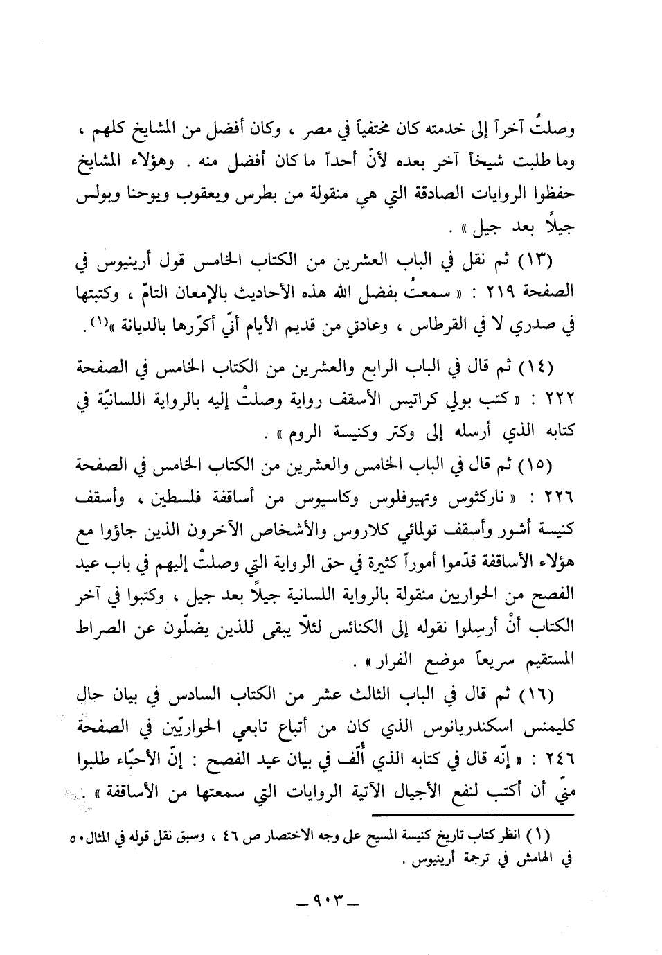 ثم نقل 13 في الباب العشرين من الكتاب الخامس قول أرينيوس في الصفحة 219: (سمعت بفضل الله هذه الأحاديث بالإمعان التام وكتبتها في صدري لا في القرطاس وعادتي من قديم الأيام أني أكررها بالديانة) . ثم قال 14 في الباب الرابع والعشرين من الكتاب الخامس في الصفحة 222: (كتب بولي كراتيس الأسقف رواية وصلت إليه بالرواية اللسانية في كتابه الذي أرسله إلى وكتر وكنيسة الروم) . ثم قال 15 في الباب الخامس والعشرين من الكتاب الخامس في الصفحة 226: (ناركثوس وتهيوفلوس وكاسيوس من أساقفة فلسطين وأسقف كنيسة اسور وأسقف تولمائي كلاروس والأشخاص الآخرون الذين جاؤوا مع هؤلاء الأساقفة قدموا أموراً كثيرة في حق الرواية التي وصلت إليهم في باب عيد الفصح من الحواريين منقولة بالرواية اللسانية جيلاً بعد جيل وكتبوا في آخر الكتاب أن أرسلوا نقوله إلى الكنائس لئلا يبقى للذين يضلون عن الصراط المستقيم سريعاً موضع الفرار) . ثم قال 16 في الباب الثالث عشر من الكتاب السادس في بيان حال كليمنس اسكندريانوس الذي كان من أتباع تابعي الحواريين في الصفحة 246: (أنه قال في كتابه الذي ألف في بيان عيد الفصح أن الأحباء طلبوا مني أن أكتب لنفع الأجيال الآتية، الروايات التي سمعتها من الأساقفة) .