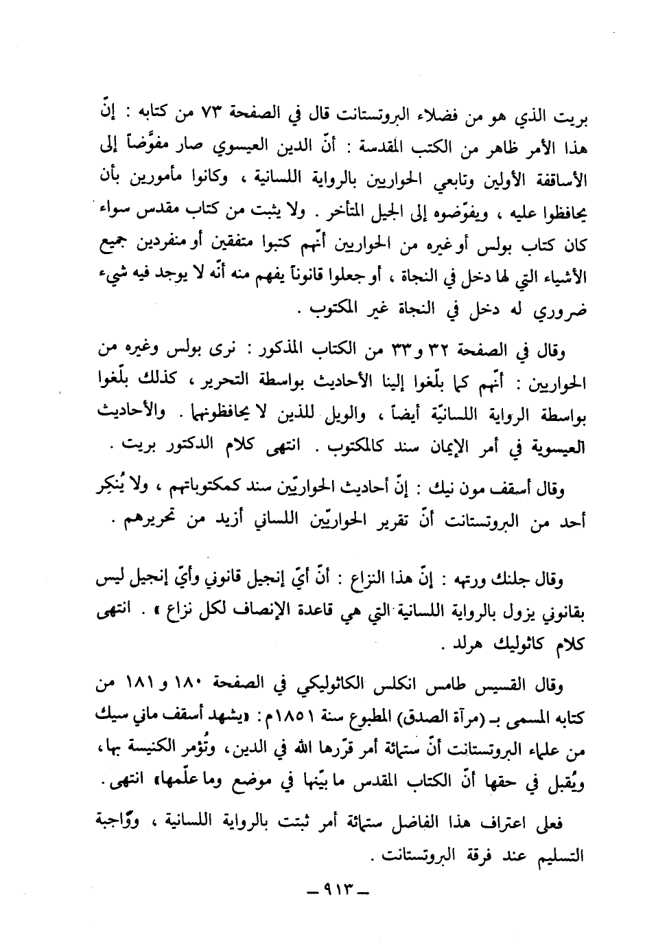 بريت الذي هو من فضلاء بروتستنت قال في الصفحة 73 من كتابه إن هذا الأمر ظاهر من الكتب المقدسة أن الدين العيسوي صار مفوضاً إلى الأساقفة الأولين وتابعي الحواريين بالرواية اللسانية وكانوا مأمورين بأن يحافظوا عليه، ويفوضوه إلى الجيل المتأخر، ولا يثبت من كتاب مقدس سواء كان كتاب بولس أو غيره من الحواريين أنهم كتبوا متفقين أو منفردين جميع الأشياء التي لها دخل في النجاة، وجعلوا قانوناً يفهم منه أنه لا يوجد فيه شيء ضروري له دخل في النجاة غير المكتوب، وقال في الصفحة 32 و 33 من الكتاب المذكور ترى بولس وغيره من الحواريين أنهم كما بلغوا إلينا الأحاديث بواسطة التحرير كذلك بلغوا بواسطة الرواية اللسانية أيضاً والويل للذين لا يحفظونهما، والأحاديث العيسوية في أمر الإيمان سند كالمكتوب، انتهى كلام داكتربريت.