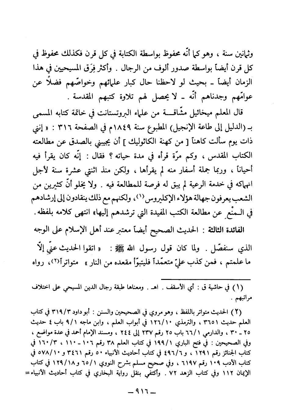 وثمانين سنة وهو كما أنه محفوظ بواسطة الكتابة في كل قرن فكذلك محفوظ في كل قرن أيضاً بواسطة صدور ألوف من الرجال، وأكثر فرق المسيحيين في هذا الزمان أيضاً بحيث لو لاحظنا حال كبار علمائهم وخواصهم فضلاً عن عوامهم، وجدناهم أنه لا يحصل لهم تلاوة كتبهم المقدسة، قال المعلم ميخائيل مشاقة من علماء بروتستنت في خاتمة كتابه المسمى بالدليل إلى طاعة الإنجيل المطبوع سنة 1849 في الصفحة 316: (أنني ذات يوم سألت كاهناً) من كهنة كاتلك (أن يجيبني بالصدق عن مطالعة الكتاب المقدس وكم مرة قرأه في مدة حياته فقال إنه كان يقرأ أحياناً وربما جملة أسفار لم يقرأها ولكن منذ اثنتي عشرة سنة لأجل انهماكه في خدمة الرعية لم يبق له فرصة المطالعة فيه، ولا يخلو أن كثيرين من الشعب يعرفون جهالة هؤلاء الاكليرس ولكنهم مع ذلك ينقادون إلى إرشادهم في المنع عن مطالعة الكتب المفيدة التي ترشدهم إليها) انتهى كلامه بلفظه.