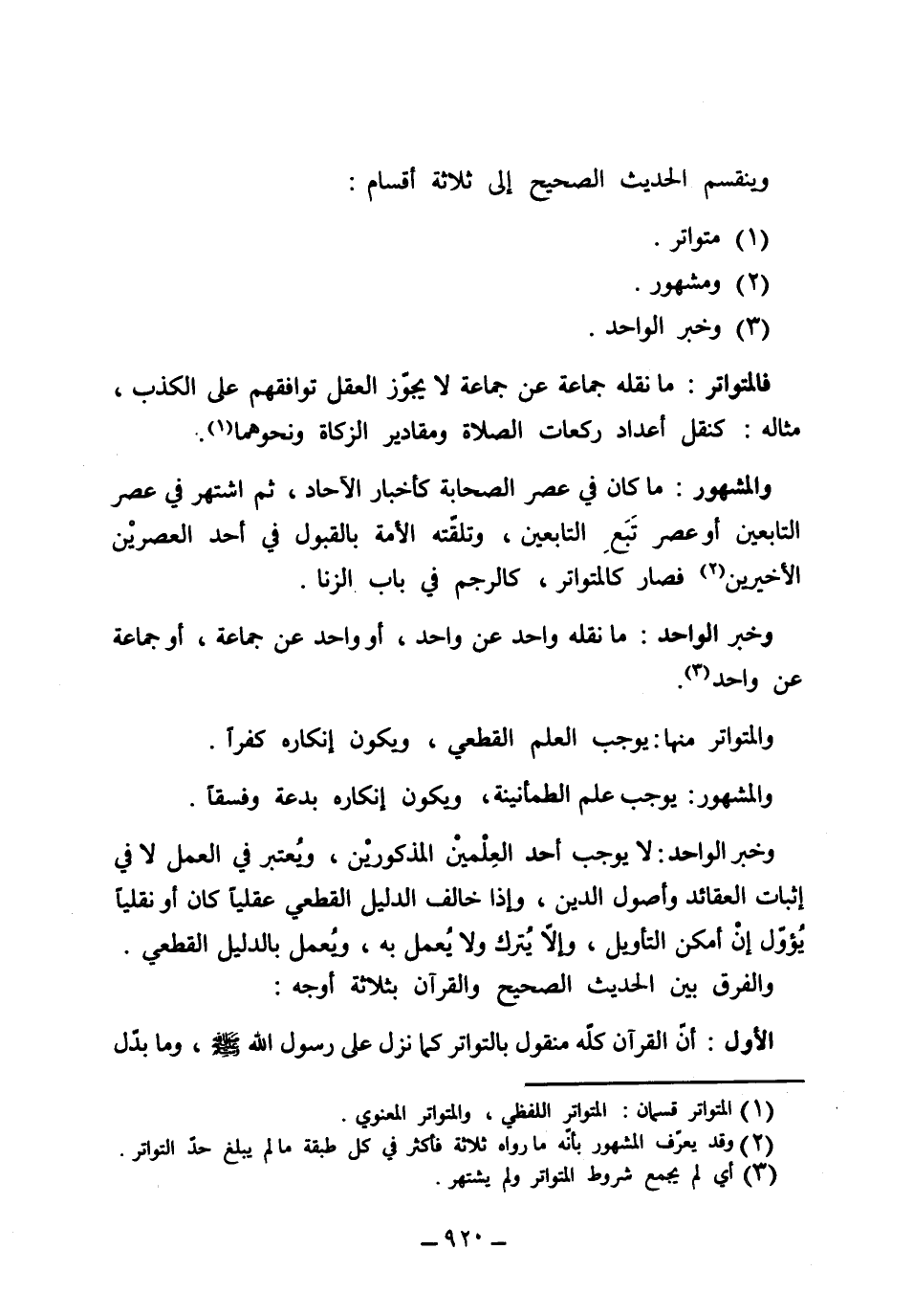 وينقسم الحديث الصحيح إلى ثلاثة أقسام متواتر [1] ومشهور [2] وخبر الواحد [3] فالمتواتر ما نقله جماعة عن جماعة لا يجوز العقل توافقهم على الكذب، مثاله كنقل أعداد ركعات الصلاة ومقادير الزكاة ونحوهما. والمشهور ما كان في عصر الصحابة كأخبار الآحاد ثم اشتهر في عصر التابعين أو عصر تبع التابعين وتلقته الأمة بالقبول في أحد العصرين الأخيرين فصار كالمتواتر، كالرجم في باب الزنا. وخبر الواحد ما نقله واحد عن واحد أو واحد عن جماعة أو جماعة عن واحد، والمتواتر منها يوجب العلم القطعي ويكون إنكاره كفراً، والمشهور يوجب علم الطمأنينة ويكون إنكاره بدعة وفسقاً، وخبر الواحد لا يوجب أحد العلمين المذكورين ويعتبر في العمل لا في إثبات العقائد وأصول الدين. وإذا خالف الدليل القطعي عقلياً كان أو نقلياً يؤول إن أمكن التأويل، وإلا يترك ولا يعمل بالدليل العقلي. والفرق بين الحديث الصحيح والقرآن بثلاثة أوجه: الأول أن القرآن كله منقول بالتواتر كما نزل على رسول الله صلى الله عليه وسلم وما بدل