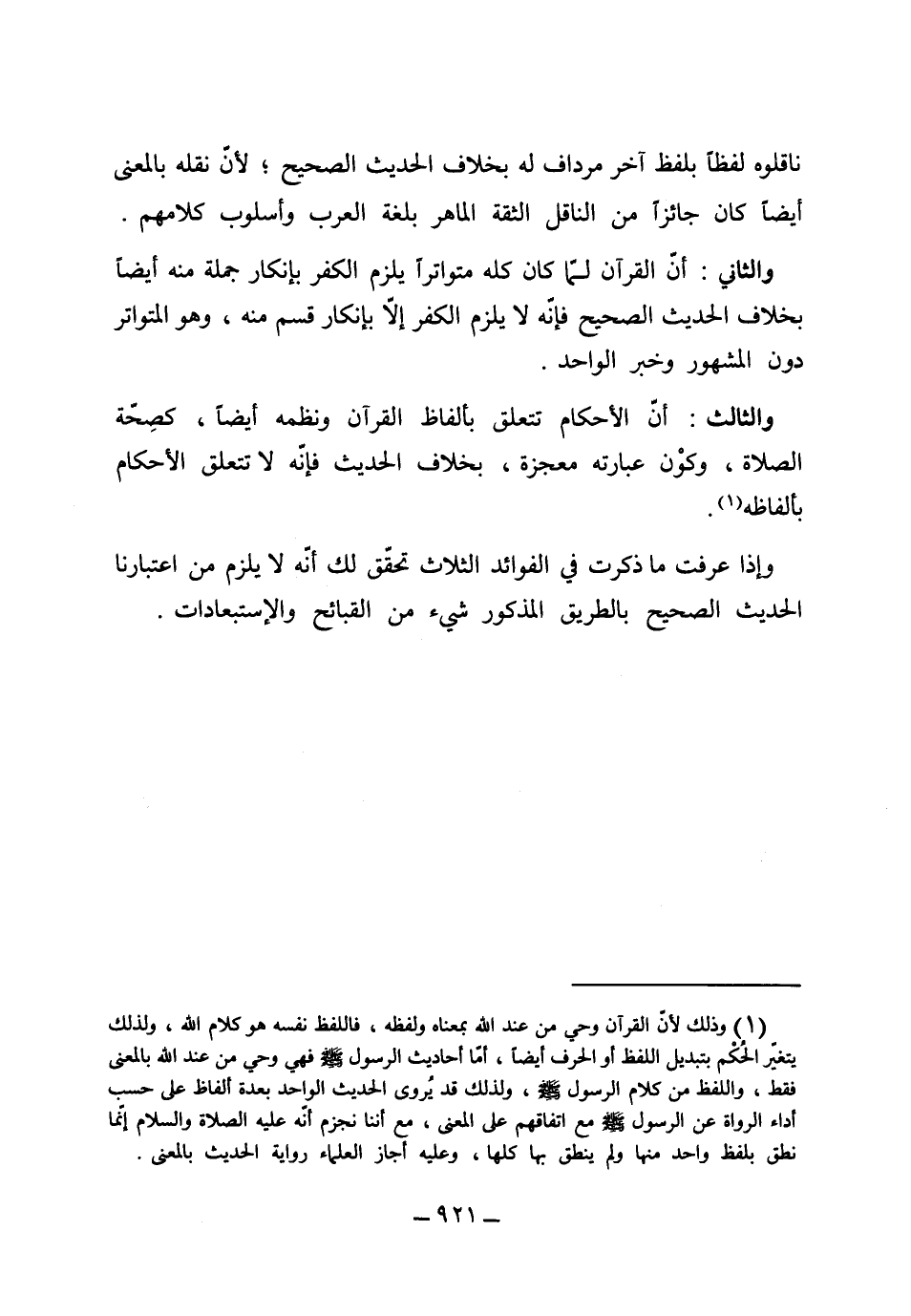 ناقلوه لفظاً بلفظ آخر مرادف له، بخلاف الحديث الصحيح لأن نقله بالمعنى أيضاً كان جائزاً للناقل الثقة الماهر بلغة العرب وأسلوب كلامهم، والثاني أن القرآن لما كان كله متواتراً يلزم الكفر بإنكار جملة منه أيضاً بخلاف الحديث الصحيح فإنه لا يلزم الكفر إلا بإنكار قسم منه وهو المتواتر دون المشهور وخبر الواحد، والثالث أن الأحكام تتعلق بألفاظ القرآن ونظمه أيضاً كصحة الصلاة وكون عبارته معجزة، بخلاف الحديث فإنه لا تتعلق الأحكام بألفاظه. وإذا عرفت ما ذكرت في الفوائد الثلاثة تحقق لك أنه لا يلزم من اعتبارنا الحديث الصحيح بالطريق المذكور شيء من القبائح والاستبعادات.