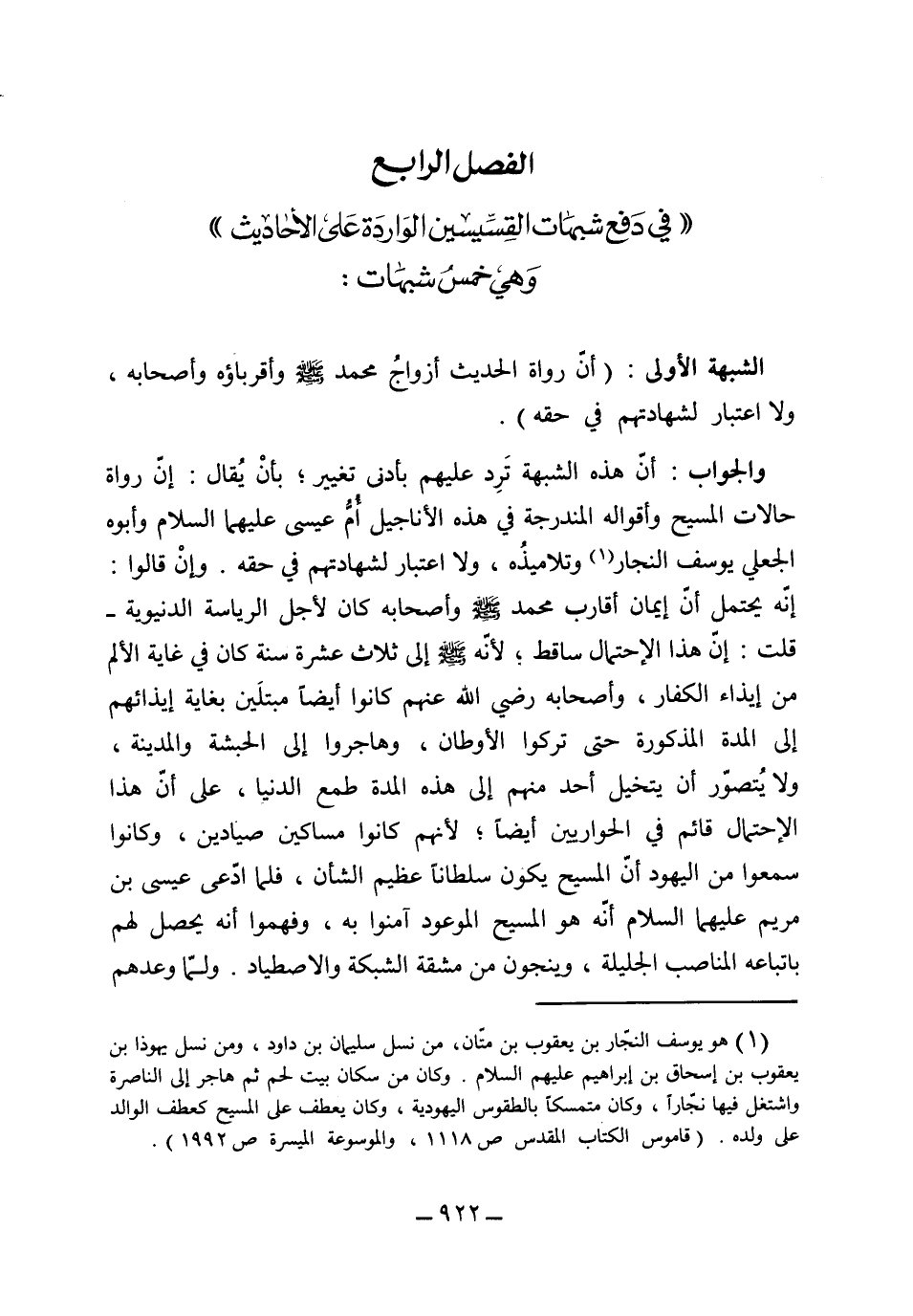 (الشبهة الأولى) أن رواة الحديث أزواج محمد صلى الله عليه وسلم وأقرباؤه وأصحابه ولا اعتبار لشهادتهم في حقه. (والجواب) أن هذه الشبهة ترد عليهم بأدنى تغير بأن يقال إن رواة الحالات المسيحية وأقواله المندرجة في هذه الأناجيل أم عيسى عليهما السلام وأبوه الجعلي يوسف النجاري وتلاميذه ولا اعتبار لشهادتهم في حقه، وإن قالوا إنه يحتمل أن إيمان أقارب محمد صلى الله عليه وسلم وأصحابه كان لأجل الرياسة الدنيوية، قلت إن هذا الاحتمال ساقط لأنه صلى الله عليه وسلم إلى ثلاث عشرة سنة كان في غاية الألم من إيذاء الكفار وأصحابه رضي الله عنهم كانوا أيضاً مبتلين بغاية إيذائهم إلى المدة المذكورة حتى تركوا الأوطان وهاجروا إلى الحبشة والمدينة، ولا يتصور أن يتخيل أحد منهم إلى هذه المدة طمع الدنيا، على أن هذا الاحتمال قائم في الحواريين أيضاً لأنهم كانوا مساكين صيادين، وكانوا سمعوا من اليهود أن المسيح يكون سلطاناً عظيم الشأن، فلما ادعى عيسى بن مريم عليهما السلام أنه هو المسيح الموعود آمنوا به وفهموا أنه يحصل لهم باتباعه المناصب الجليلة، وينجون عن مشقة الشبكة والاصطياد ولما وعدهم