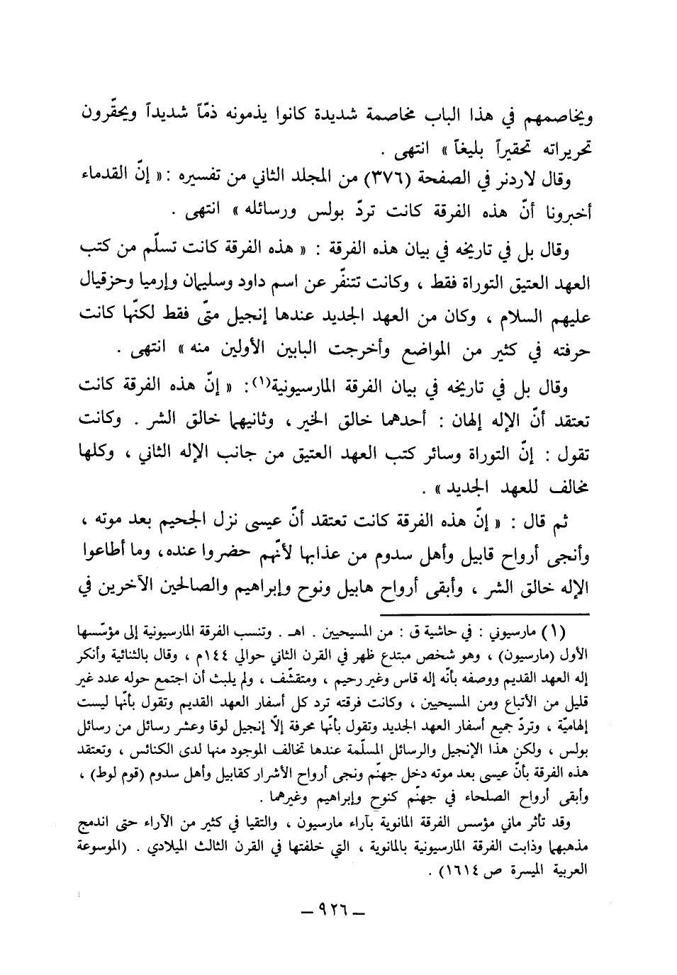ويخاصمهم في هذا الباب مخاصمة شديدة كانوا يذمونه ذماً شديداً ويحقرون تحريراته تحقيراً بليغاً انتهى. وقال لاردنر في الصفحة 376 من المجلد الثاني من تفسيره: (إن القدماء أخبرونا أن هذه الفرقة كانت ترد بولس ورسائله) انتهى. وقال بل في تاريخه في بيان هذه الفرقة: (هذه الفرقة كانت تسلم من كتب العهد العتيق التوراة فقط وكانت تنفر من اسم داود وسليمان وأرمياء وحزقيال عليهم السلام، وكان من العهد الجديد عندها إنجيل متى فقط لكنها كانت حرفته في كثير من المواضع وأخرجت البابين الأولين منه) انتهى، وقال في تاريخه في بيان الفرقة المارسيونية: (إن هذه الفرقة كانت تعتقد أن الإله إلهان أحدهما خالق الخير وثانيهما خالق الشر وكانت تقول التوراة وسائر كتب العهد العتيق من جانب الإله الثاني وكلها مخالف للعهد الجديد ثم قال إن هذه الفرقة كانت تعتقد أن عيسى نزل الجحيم بعد موته وأنجى أرواح قابيل وأهل سدوم من عذابها لأنهم حضروا عنده وما أطاعوا الإله خالق الشر وأبقى أرواح هابيل ونوح وإبراهيم والصالحين الآخرين في