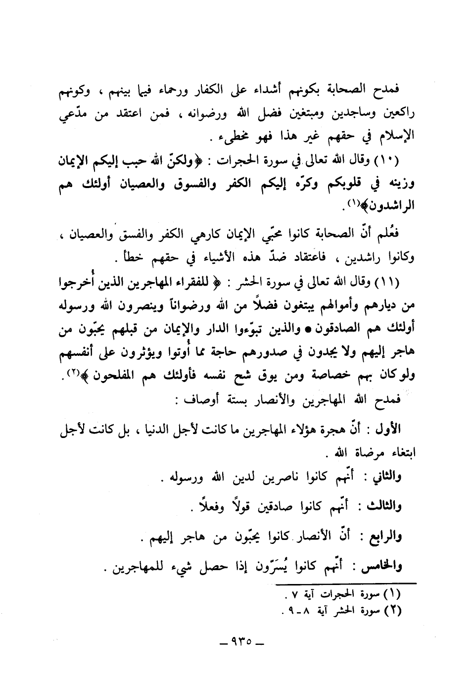 10- وقال الله تعالى في سورة الحجرات: {ولكن الله حبب إليكم الإيمان وزينه في قلوبكم، وكره إليكم الكفر والفسوق والعصيان أولئك هم الراشدون} . فعلم أن الصحابة كانوا محبي الإيمان كارهي الكفر والفسق والعصيان وكانوا راشدين، فاعتقاد ضد هذه الأشياء في حقهم خطأ.