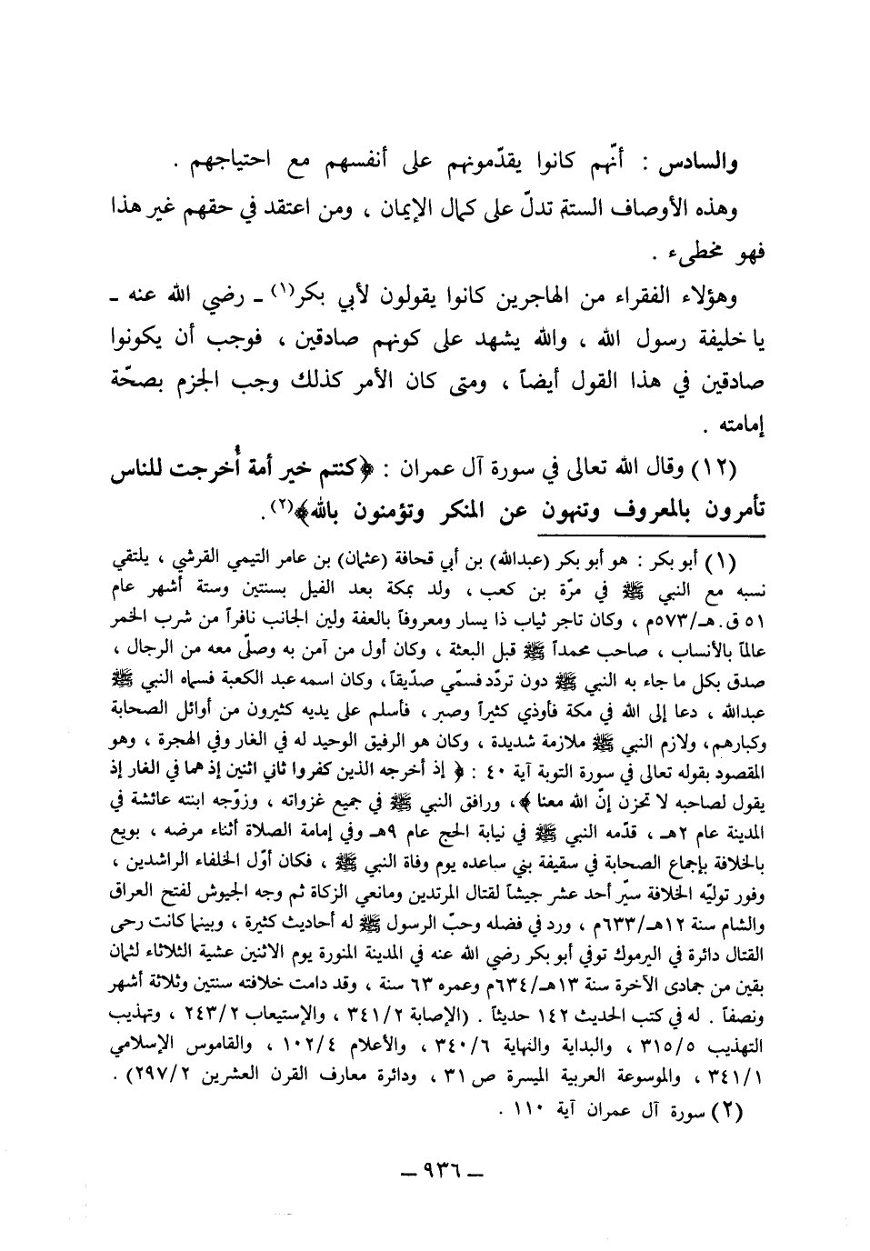 (والسادس) أنهم كانوا يقدمونهم على أنفسهم مع احتياجهم، وهذه الأوصاف الستة تدل على كمال الإيمان ومن اعتقد في حقهم غير هذا فهو مخطئ وهؤلاء الفقراء من المهاجرين كانوا يقولون لأبي بكر رضي الله عنه يا خليفة رسول الله والله يشهد على كونهم صادقين فوجب أن يكونوا صادقين في هذا القول أيضاً ومتى كان الأمر كذلك وجب الجزم بصحة إمامته.
