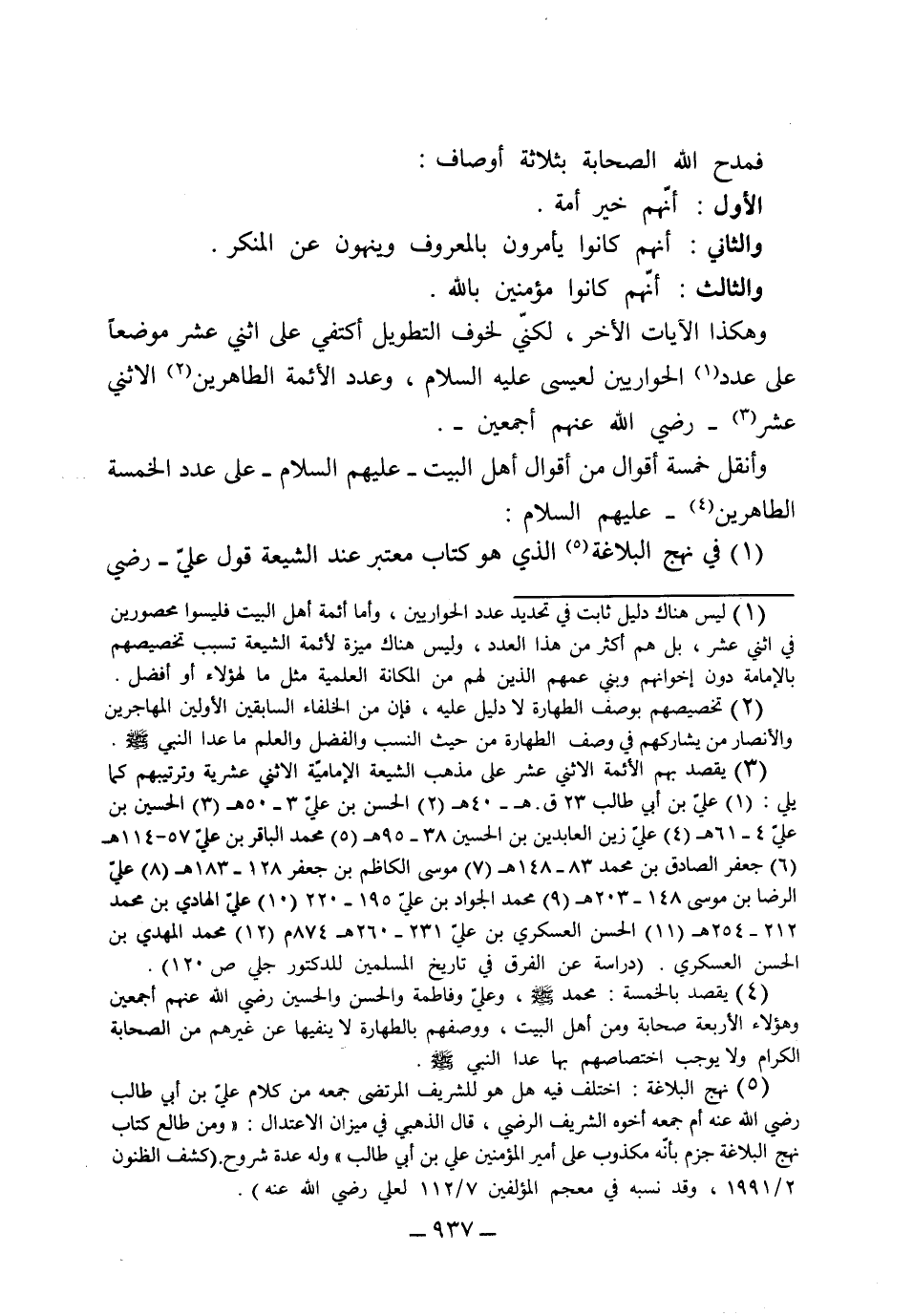 فمدح الله الصحابة بثلاثة أوصاف: (الأول) أنهم خير أمة. (والثاني) أنهم كانوا يأمرون بالمعروف وينهون عن المنكر. (والثالث) أنهم كانوا مؤمنين بالله، وهكذا الآيات الأخر لكني لخوف التطويل أكتفي على اثني عشر موضعاُ على عدد الحواريين لعيسى عليه السلام وعدد الأئمة الطاهرين الاثني عشر رضي الله عنهم أجمعين.