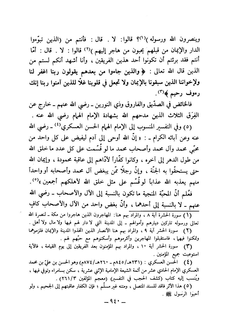 فالخائض في الصديق والفاروق وذي النورين رضي الله عنهم خارج عن الفرق الثلاث الذين مدحهم الله بشهادة الإمام الهمام رضي الله عنه. وفي التفسير المنسوب إلى الإمام الهمام الحسن العسكري رضي الله عنه وعن آبائه الكرام: (إن الله أوحى إلى آدم ليفيض على كل واحد من محبي محمد وآل محمد وأصحاب محمد ما لو قسمت على كل عدد ما خلق الله من طول الدهر إلى آخره وكانوا كفاراً لأداهم إلى عاقبة محمودة وإيمان بالله حتى يستحقوا به الجنة. وإن من يبغض آل محمد وأصحابه أو واحداً منهم يعذبه الله عذاباً لو قسم على مثل خلق الله لأهلكهم أجمعين) .