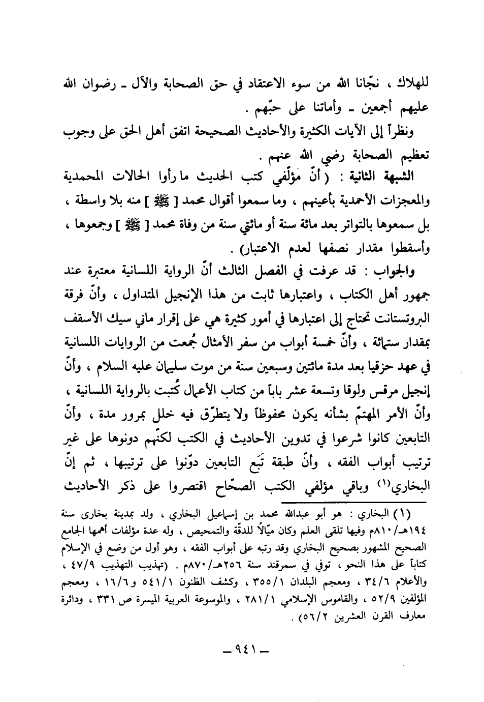(والجواب) قد عرفت في الفصل الثالث أن الرواية اللسانية معتبرة عند جمهور أهل الكتاب واعتبارها ثابت من هذا الإنجيل المتداول، وأن فرقة بروتستنت تحتاج إلى اعتبارها في أمور كثيرة هي على إقرار (ماني سيك) الأسقف بمقدار ستمائة، وأن خمسة أبواب من سفر الأمثال جمعت من الروايات اللسانية، في عهد حزقيا بعد مدة مائتين وسبعين سنة من موت سليمان عليه السلام، وأن إنجيل مرقس ولوقا وتسعة عشر باباً من كتاب الأعمال كتبت بالرواية اللسانية وأن الأمر المهتم بشأنه يكون محفوظاً ولا يتطرق فيه خلل بمرور مدة، وأن التابعين كانوا شرعوا في تدوين الأحاديث في الكتب لكنهم دونوها على غير ترتيب أبواب الفقه، وأن طبقة تبع التابعين دونوها على ترتيبها، ثم إن البخاري وباقي مؤلفي الكتب الصحاح اقتصروا على ذكر الأحاديث