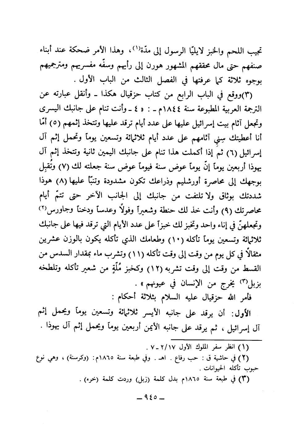 [3] ووقع في الباب الرابع من كتاب حزقيال هكذا وأنقل عبارته عن الترجمة العربية المطبوعة سنة 1844: [4] : (وأنت تنام على جانبك الأيسر وتجعل آثام بيت إسرائيل عليها على عدد أيام ترقد عليها وتتخذ إثمهم [5] أما أنا أعطيتك سني آثامهم على عدد أيام ثلثمائة وتسعين يوماً وتحمل إثم آل إسرائيل) 6: (ثم إذا كملت هذا تنام على جانبك اليمين ثانية وتتخذ إثم آل يهوذا أربعين يوماً إن يوماً عوض سنة جعلته لك) 7: (وتقبل بوجهك إلى محاصرة أورشليم وذراعك تكون مشدودة وتبني عليها) 8: (هوذ شددتك بوثاق ولا تلتفت من جانبك إلى الجانب الآخر حتى تتم أيام محاصراتك) 9: (وأنت خذ لك حنطة وشعيراً وفولاً وعدساً ودخناً وجاروس وتجعلهن في إناء واحد وتخبز لك خبزاً على عدد الأيام التي ترقد فيها على جانبك ثلثمائة وتسعين يوماً تأكله) 10: (وطعامك الذي تأكله يكون بالوزن عشرين مثقالاً في كل يوم من وقت إلى وقت تأكله) 11: (وتشرب ماء بمقدار السدس من القسط من وقت إلى وقت تشربه) 12: (وكخبز ملة من شعير تأكله وتلطخه بزبل يخرج من الإنسان في عيونهم) .