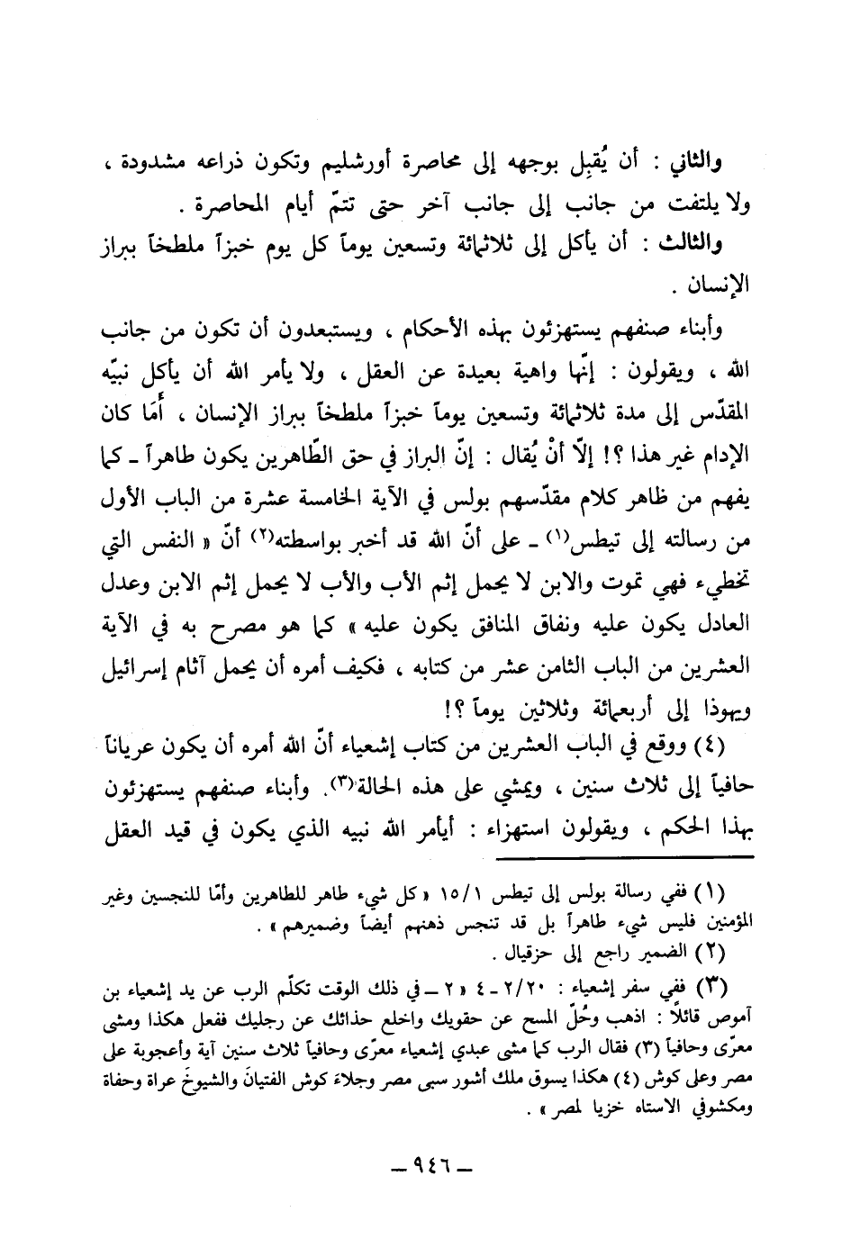 (والثالث) أن يأكل إلى ثلثمائة وتسعين يوماً خبزاً ملطخاً ببراز الإنسان وأبناء صنفهم يستهزئون بهذه الأحكام ويستبعدون أن تكون من جانب الله، ويقولون إنها واهية بعيدة عن العقل ولا يأمر الله أن يأكل نبيه المقدس إلى مدة ثلثمائة وتسعين يوماً خبزاً ملطخاً ببراز الإنسان، أما كان الإدام غير هذا، إلا أن يقال إن البراز في حق الطاهرين يكون طاهراً كما يفهم من ظاهر كلام مقدسهم بولس في الآية الخامسة عشرة من الباب الأول من رسالته إلى تيطس، على أن الله قد أخبر بواسطته (إن النفس التي تخطئ فهي تموت والابن لا يحمل إثم الأب والأب لا يحمل إثم الابن، وعدل العادل يكون عليه ونفاق المنافق يكون عليه) كما هو مصرح به في الآية العشرين من الباب الثامن عشر من كتابه، فكيف أمره أن يحمل آثام إسرائيل ويهوذا إلى أربعمائة وثلاثين يوماً.