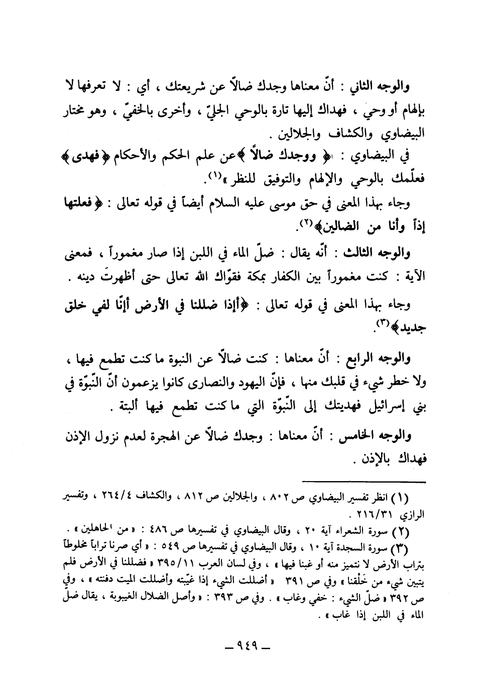 (والثاني) أن معناها وجدك ضالاً عن شريعتك أي لا تعرفها إلا بإلهام أو وحي فهداك إليها تارة بالوحي الجلي وأخرى بالخفي وهو مختار البيضاوي والكشاف والجلالين. في البيضاوي ووجدك ضالاً عن علم الحكم والأحكام فهدى، فعلمك بالوحي والإلهام والتوفيق للنظر وجاء بهذا المعنى في حق موسى عليه السلام أيضاً في قوله تعالى: {فعلتها إذاً وأنا من الضالين} .