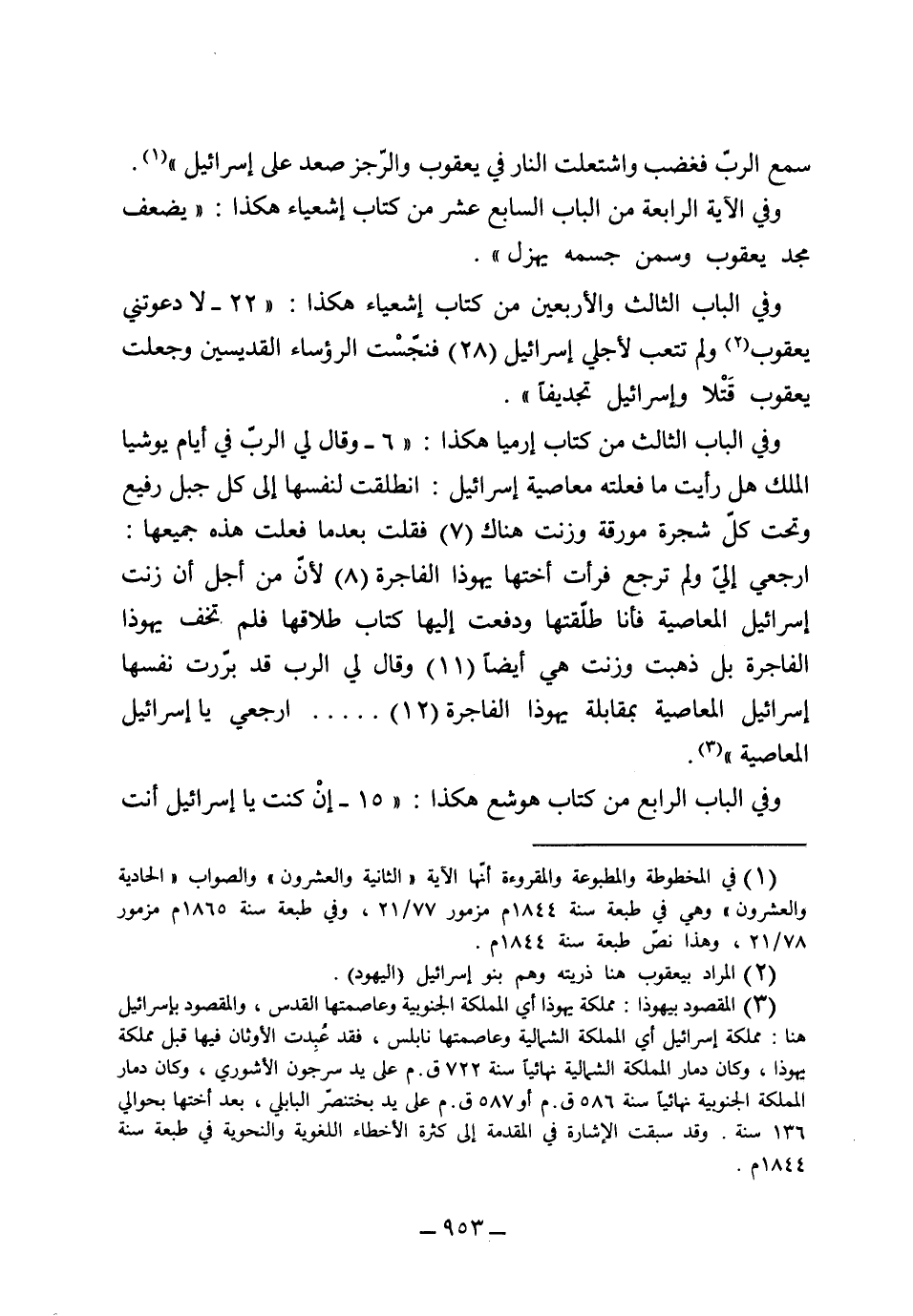 وفي الباب الثالث والأربعين من كتاب أشعيا هكذا: 22: (لا دعوتني يعقوب ولن تتعب لأجلي إسرائيل) 28: (فنجست الرؤساء القديسين وجعلت يعقوب قتلاً وإسرائيل تجديفاً) .