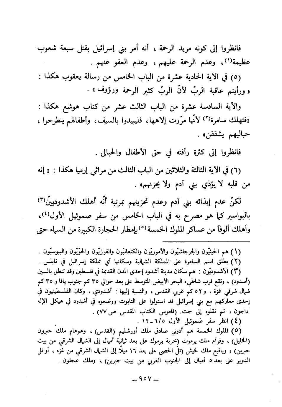 (6) في الآية الثالثة والثلاثين من الباب الثالث من مراثي أرمياء هكذا: (أنه من قلبه لا يؤذي بني آدم ولا يحزنهم) ، لكن عدم إيذائه بني آدم وعدم تحزينهم بمرتبة أنه أهلك الأشدوديين بالبواسير كما هو مصرح به في الباب الخامس من سفر صموئيل الأول، وأهلك ألوفاً من عساكر الملوك الخمسة بإمطار الحجارة الكبيرة من السماء حتى