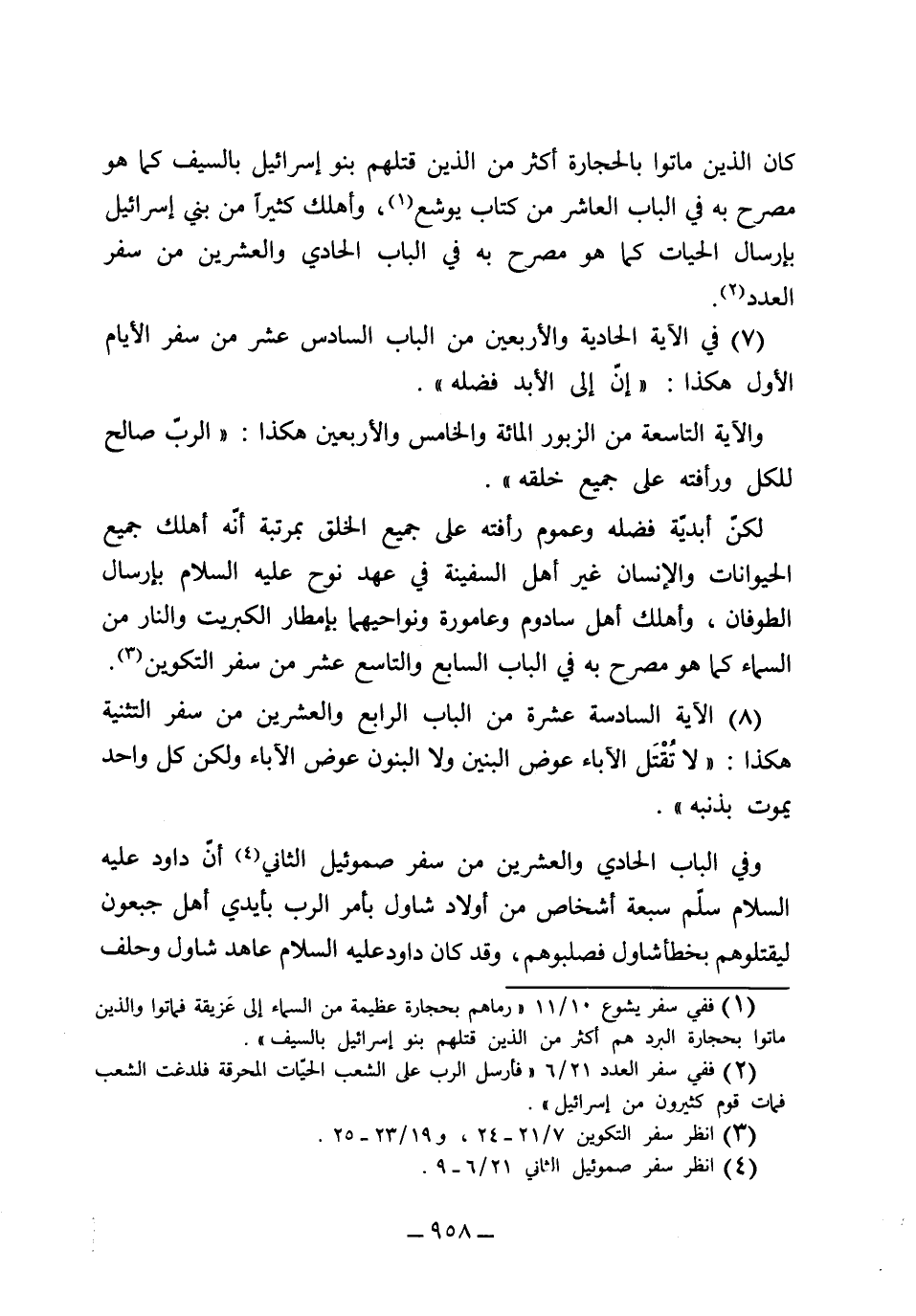 (7) في الآية الحادية والأربعين من الباب السادس عشر من سفر الأيام الأول هكذا: (أن فضله أبدي) والآية التاسعة من زبور المائة والخامس والأربعين هكذا: (الرب صالح للكل ورأفته على جميع خلقه) لكن أبدية فضله وعموم رأفته على جميع الخلق بمرتبة أنه أهلك جميع الحيوانات والإنسان غير أهل السفينة في عهد نوح عليه السلام بإرسال الطوفان وأهلك أهل سادوم وعاموره ونواحيها بإمطار الكبريت والنار من السماء كما هو مصرح به في الباب السابع والتاسع عشر من سفر التكوين.