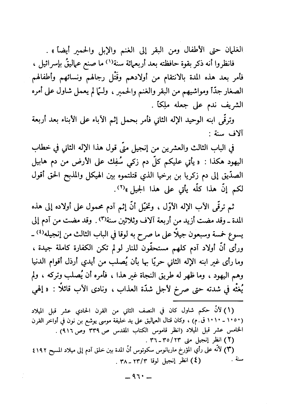 والغلمان حتى الأطفال والبقر والغنم والحمير أيضاً) . فانظروا إنه ذكر بقوة حافظته بعد أربعمائة سنة ما صنع عماليق بإسرائيل فأمر بعد هذه المدة بالانتقام من أولادهم وقتل رجالهم ونسائهم وأطفالهم الصغار جداً ومواشيهم من البقر والغنم والحمير ولما لم يعمل شاول على أمره الشريف ندم على جعله ملكاً وترقى ابنه الوحيد الإله الثاني فأمر بحمل إثم الآباء على الأبناء بعد أربعة آلاف سنة.