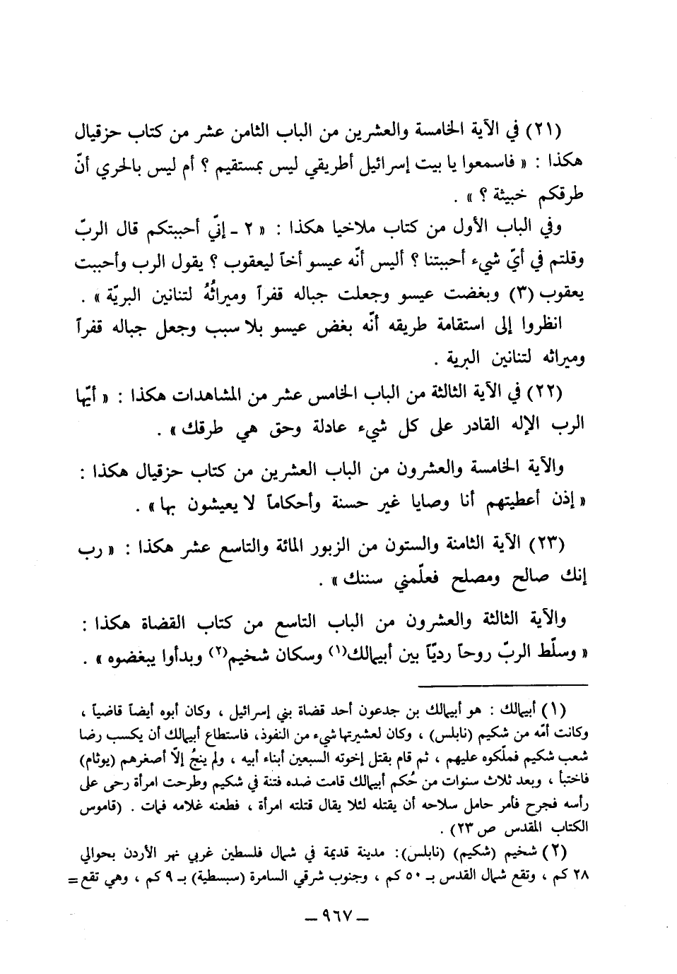 (23) الآية الثامنة والستون من الزبور المائة والتاسع عشر هكذا: (رب إنك صالح ومصلح فعلمني سننك) والآية الثالثة والعشرون من الباب التاسع من كتاب القضاة هكذا: (وسلط الرب روحاً ردياً بين أبي مالك وسكان شخيم وبدوا يبغضوه) .