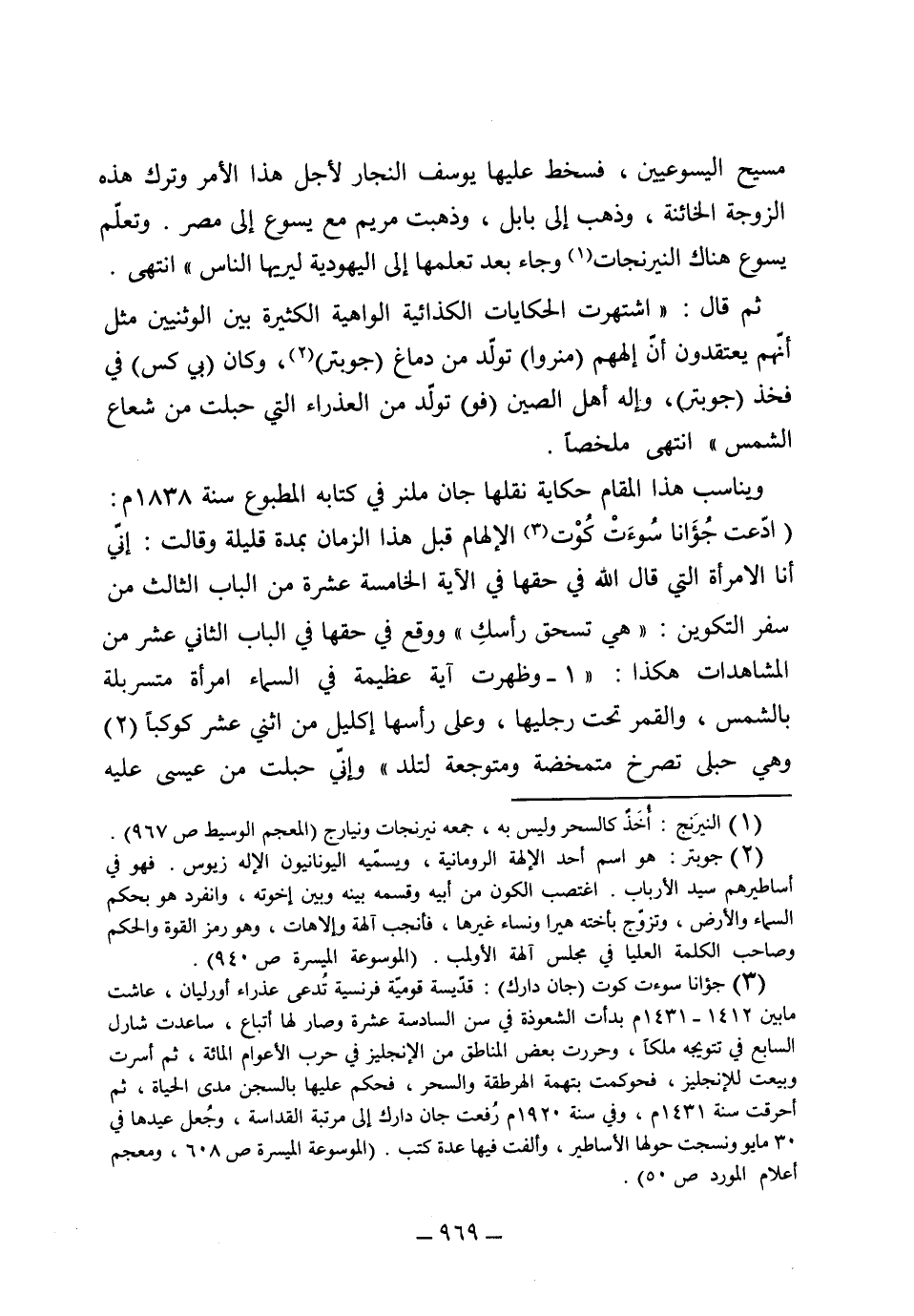 مسيح اليسوعيين فسخط عليها يوسف النجار لأجل هذا الأمر وترك هذه الزوجة الخائنة وذهب إلى بابل وذهبت مريم مع يسوع إلى مصر وتعلم يسوع هناك النيرنجات وجاء بعد تعلمها إلى اليهودية ليريها الناس) انتهى. ثم قال: (اشتهرت الحكايات الكذائية الواهية الكثيرة بين الوثنيين مثل أنهم يعتقدون أن إلههم منرو تولد من دماغ جوبتر وكان بي كس في فخذ جوبتر، وإله أهل الصين فتولد من العذراء التي حبلت من شعاع الشمس) انتهى ملخصاً.