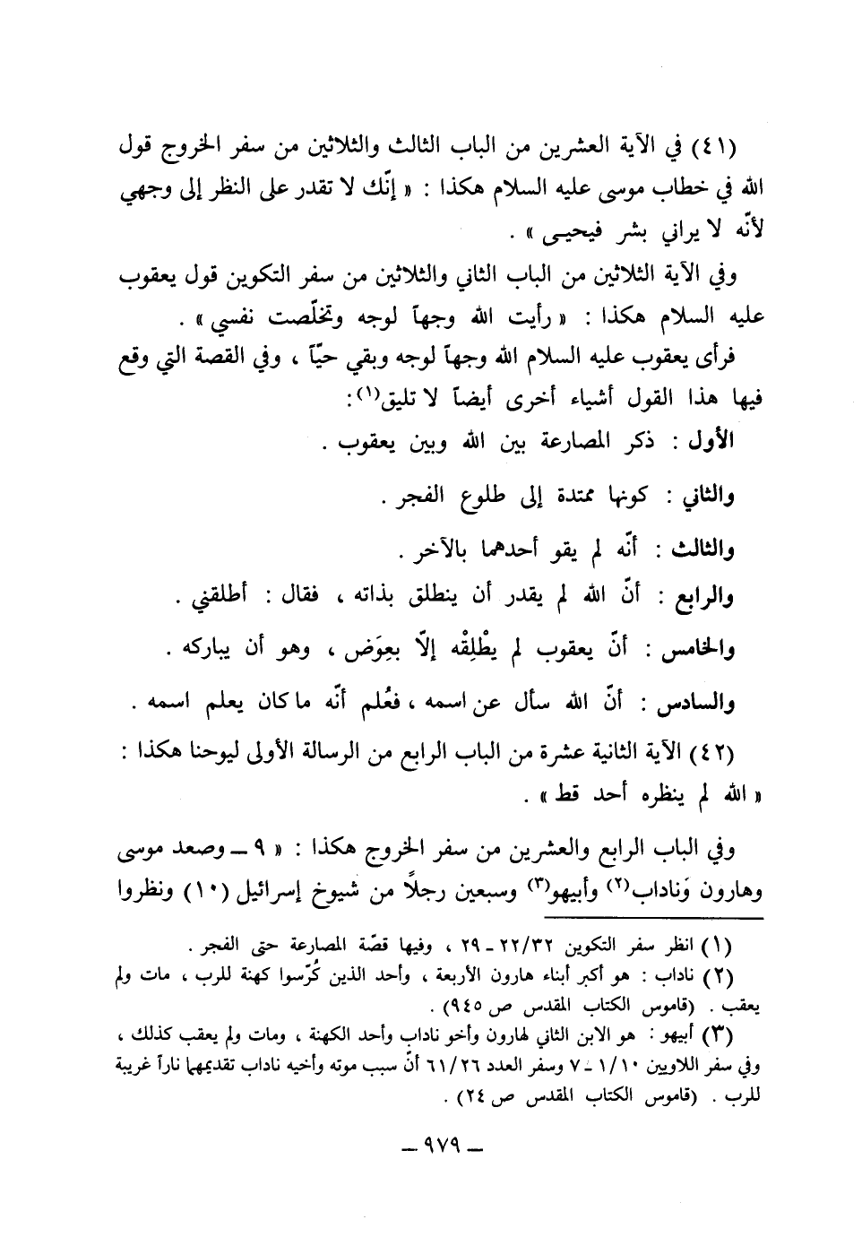 (41) في الآية العشرين من الباب الثالث والثلاثين من سفر الخروج قول الله في خطاب موسى عليه السلام هكذا: (إنك لا تقدر على النظر إلى وجهي لأنه لا يراني بشر فيحيا) . وفي الآية الثلاثين من الباب الثاني والثلاثين من سفر التكوين قول يعقوب عليه السلام هكذا: (رأيت الله وجهاً لوجه وتخلصت نفسي) . فرأى يعقوب عليه السلام الله وجهاً لوجه وبقي حياً، وفي القصة التي وقع فيها هذا القول أشياء أخرى أيضاً لا تليق. الأول: ذكر المصارعة بين الله وبين يعقوب. والثاني: كونها ممتدة إلى طلوع الفجر. والثالث: أنه لم يقو أحدهما بالآخر. والرابع: أن الله لم يقدر أن ينطلق بذاته فقال أطلقني. والخامس: أن يعقوب لم يطلقه إلا بعوض وهو أن يباركه. والسادس: أن الله سأله عن اسمه فعلم أنه ما كان يعلم اسمه.