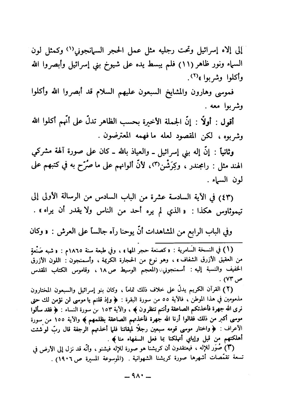 إلى إله إسرائيل وتحت رجليه مثل الحجر السمانجوني وكمثل لون السماء ونور ظاهر) 11 (فلم يبسط يده على شيوخ إسرائيل وأبصروا الله وأكلوا وشربوا) فموسى [ص 168] وهارون والمشايخ السبعون عليهم السلام قد أبصروا الله وأكلوا وشربوا معه أقول أولاً: أن الجملة الأخيرة بحسب الظاهر تدل على أنهم أكلوا الله وشربوه، لكن المقصود لعله ما فهمه المعترضون. وثانياً: أن إله بني إسرائيل (والعياذ بالله) كان على صورة آلهة مشركي الهند مثل رامجند روكرشن لأن ألوانهم على ما صرح به في كتبهم على لون السماء.