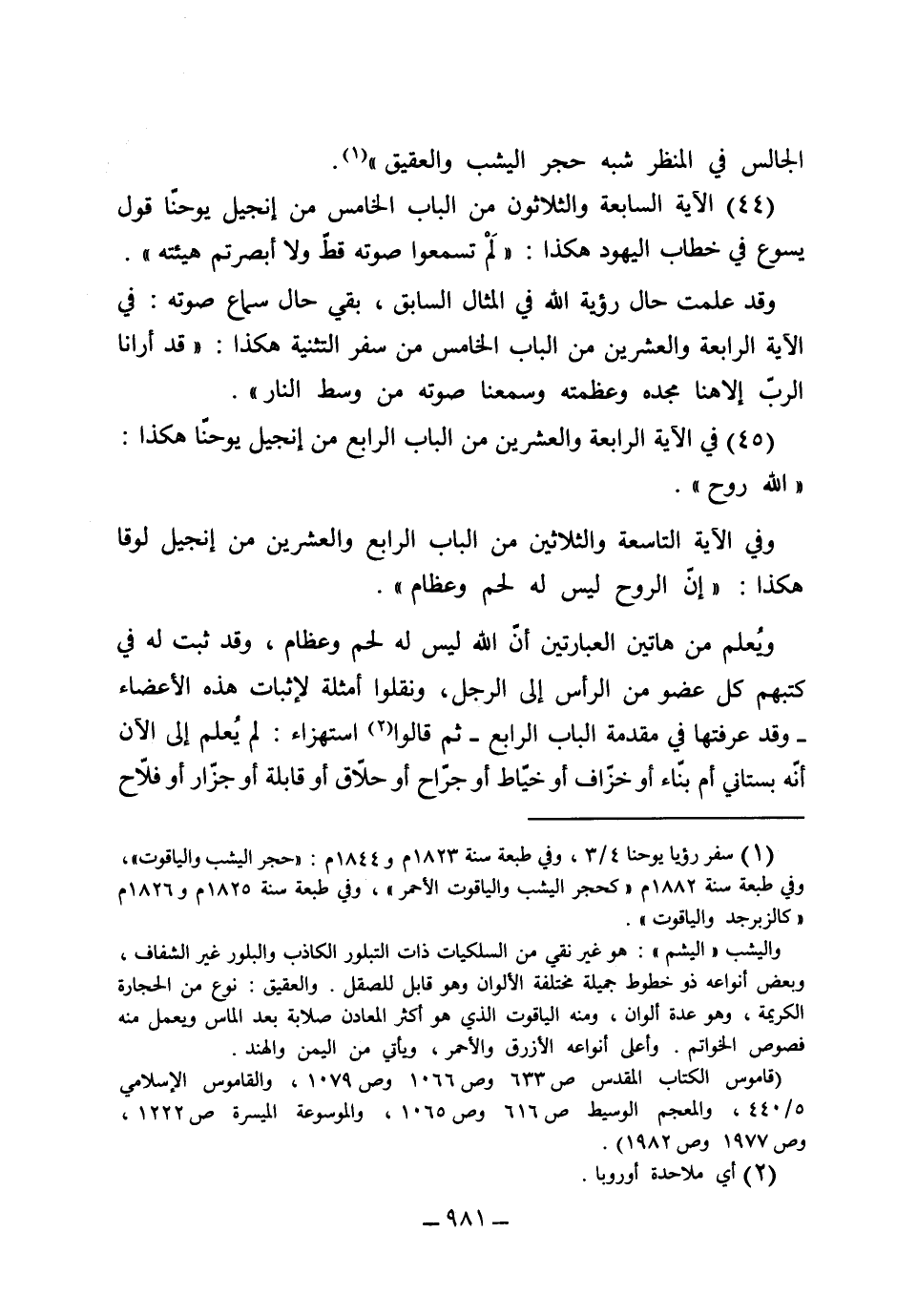(45) في الآية الرابعة والعشرين من الباب الرابع من إنجيل يوحنا هكذا: (الله روح) . وفي الآية التاسعة والثلاثين من الباب الرابع والعشرين من إنجيل لوقا هكذا: (أن الروح ليس له لحم وعظام) ويعلم من هاتين العبارتين أن الله ليس له لحم وعظام، وقد ثبت له في كتبهم كل عضو من الرأس إلى الرجل ونقلوا أمثلة لإثبات هذه الأعضاء وقد عرفتها في مقدمة الباب الرابع. ثم قالوا استهزاءً: "لم يعلم إلى الآن أنه بستاني أم بناء أو خزاف أو خياط أو جراح أو حلاق أو قابلة أو جزار أو فلاح