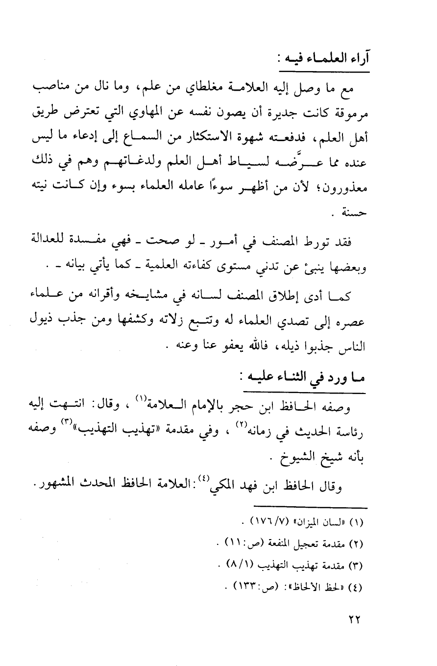 آراء العلماء فيه: مع ما وصل إليه العلامة مغلطاي من علم، وما نال من مناصب مرموقة كانت جديرة أن يصون نفسه عن المهاوي التي تعترض طريق أهل العلم، فدفعته شهوة الاستكثار من السماع إلى إدعاء ما ليس عنده مما عرضه لسياط أهل العلم ولدغاتهم وهم في ذلك معذورون، لأن من أظهر سوءا عامله العلماء بسوء وإن كانت نيته حسنة.