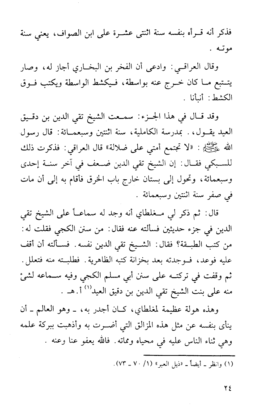 وقد قال في هذا الجزء: سمعت الشيخ تقي الدين بن دقيق العيد يقول،. بمدرسة الكاملية، سنة اثنتين وسبعمِائَة: قال رسول الله صلى الله عليه وسلم: (لا تجتمع أمتي على ضلالة) قال العراقي: فذكرت ذلك للسبكي فقال: إن الشيخ تقي الدين ضعف في آخر سنة إحدى وسبعمِائَة، وتحول إلى بستان خارج باب الخرق فأقام به إلى أن مات في صفر سنة اثنتين وسبعمِئَة.