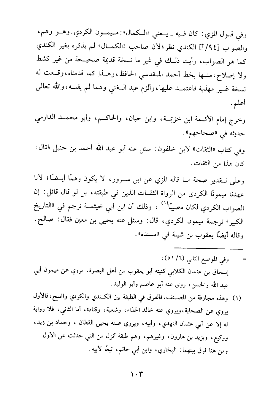 وعلى تقدير صحة ما قاله المزي عن ابن سرور، لا يكون وهما أيضا، لأنا عهدنا ميمونا الكردي من الروات الثقات الذين في طبقته، بل لو قال قائل: إن الصواب الكردي لكان مصيبا (1)، وذلك أن ابن أبي خيثمة ترجم في (التاريخ الكبير) ترجمة ميمون الكردي، قال: وسئل عنه يحيى بن معين فقال: صالح.