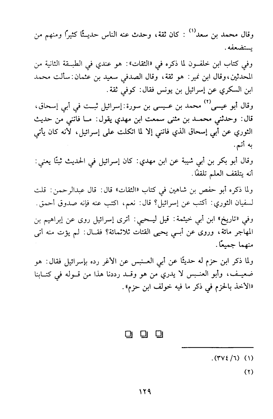 وفي كتاب ابن خلفون لما ذكره في "الثقات": عندي في الطبقة الثانية من المحدثين، وقال ابن نمير: هو ثقة، وقال الصدفي سعيد بن عثمان سألت محمد بن السكري عن إسرائيل بن يونس فقال: كوفي ثقة.