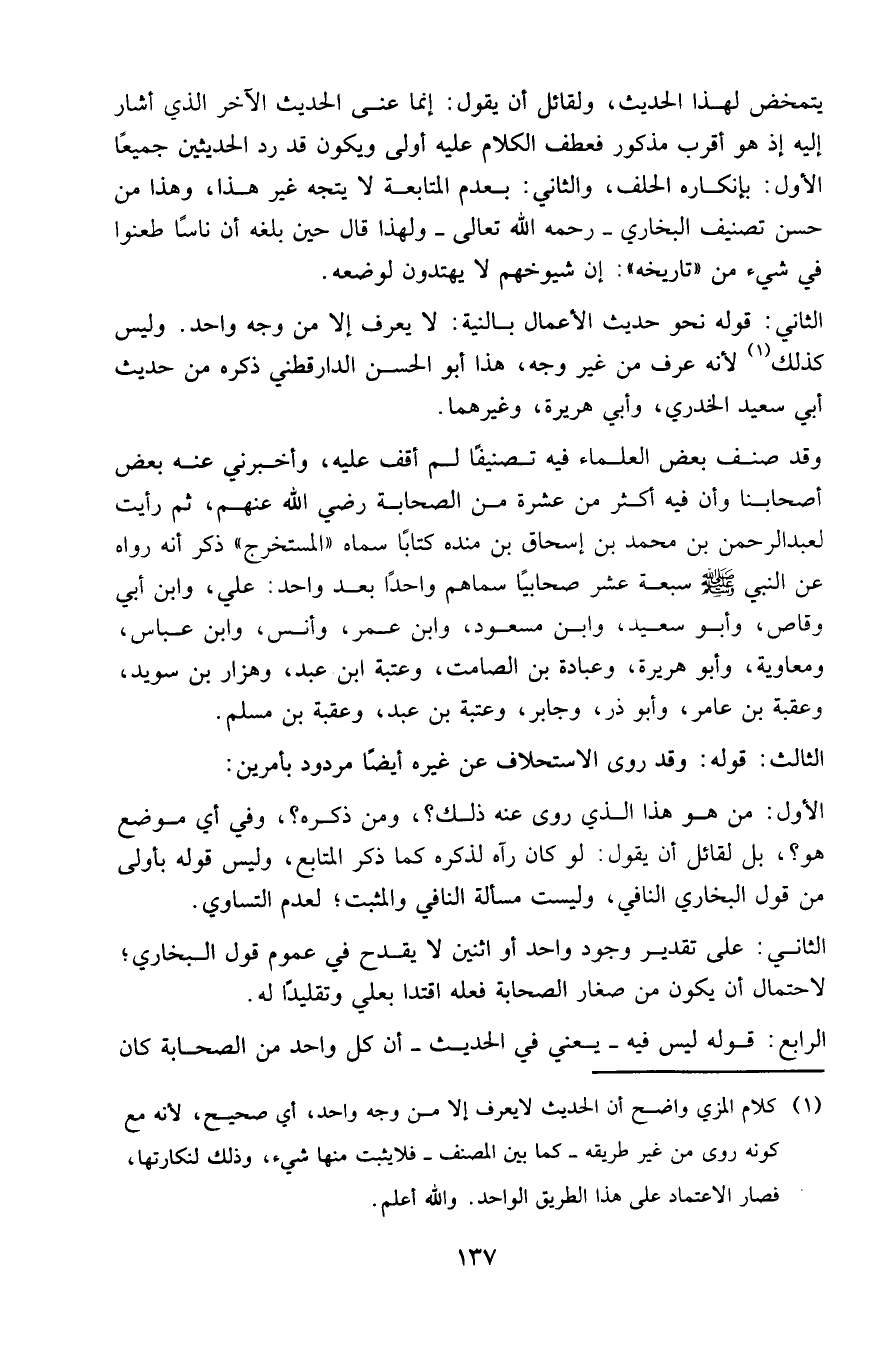 الثاني: قوله نحو حديث الأعمال بالنية: لا يعرف إلا من وجه واحد، وليس كذلك (1) لأنه عرف من غير وجه، هذا أبو الحسن الدارقطني ذكره من حديث أبي سعيد الخدري، وأبي هريرة، وغيرهما.