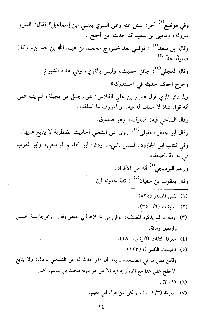 (5) الضعفاء الكبير (1/123) ولكن نص ما في الضعفاء - بعد أن ذكر حديثا له عن الشعبي - قال: ولا يتابع الأجلح على هذا مع اضطرابه في ه إلا من هو دونه محمد بن سالم. اهـ (6) (301).