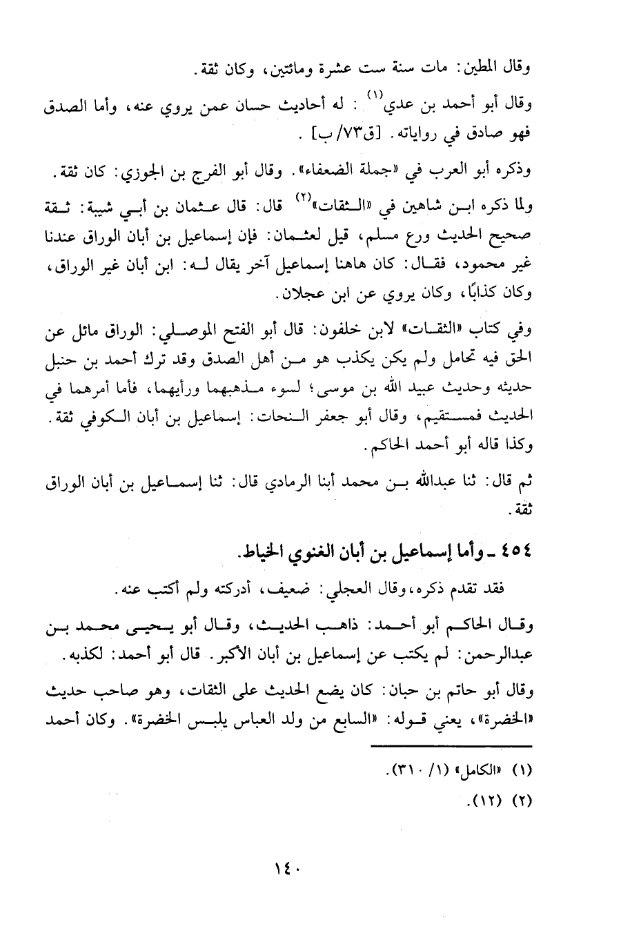 وفي كتاب "الثقات" لابن خلفون: قال أبو الفتح الموصلي: الوراق مائل عن الحق فيه تحامل ولم يكن يكذب هو من أهل الصدق وقد ترك أحمد بن حنبل حديثه وحديث عبيد الله بن موسى، لسوء مذهبهما ورأيهما، فأما أمرهما في الحديث فمستقيم، وقال أبو جعفر النحات: إسماعيل بن أبان الكوفي ثقة.