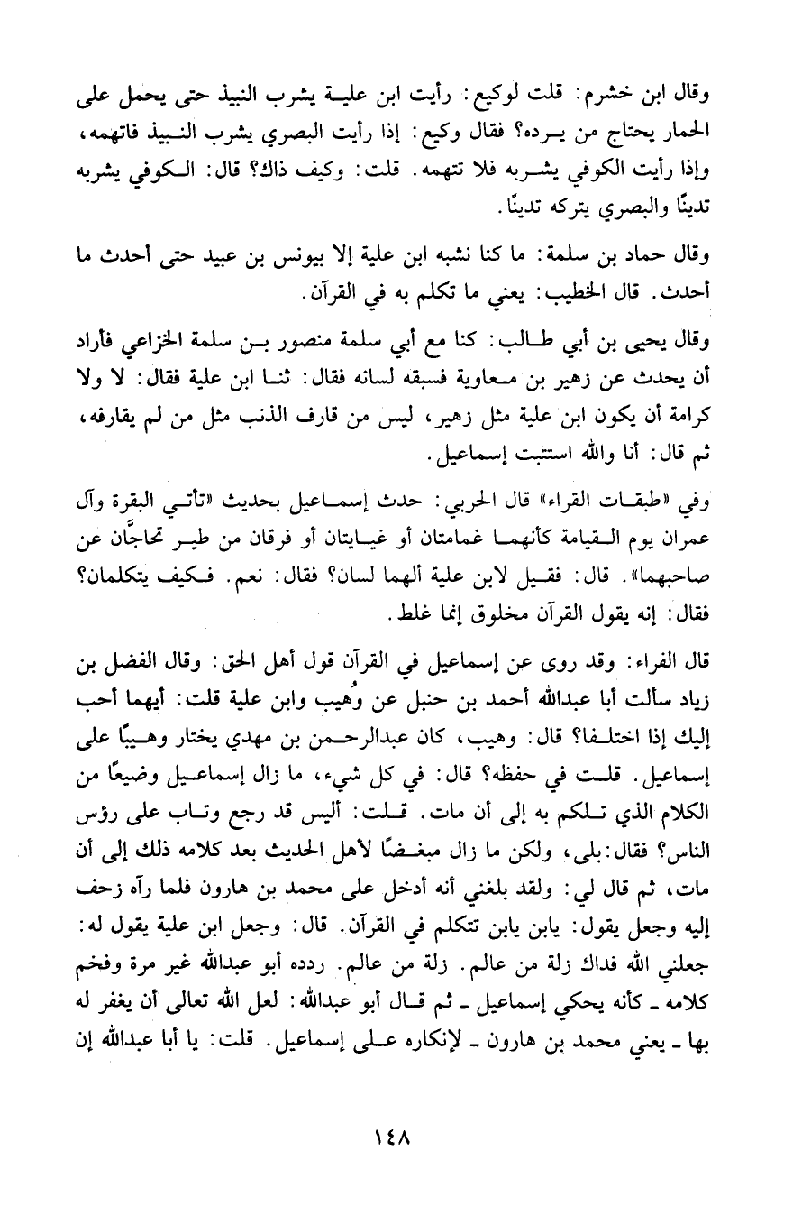 قال الفراء: وقد روى عن إسماعيل في القرآن قول أهل الحق: وقال الفضل بن زياد سألت أبا عبد الله أحمد بن حنبل عن وهيب وابن علية قلت: أيهما أحب إليك إذا اختلفا ؟ قال: وهيب، كان عبد الرحمن بن مهدي يختار وهيبا على إسماعيل. قلت في حفظه ؟ قال: في كل شئ، ما زال إسماعيل وضيعا من الكلام الذي تكلم به إلى أن مات. قلت: أليس قد رجع وتاب على رؤُوس الناس فقال: بلى، ولكن ما زال مبغضا لأهل الحديث بعد كلامه ذلك إلى أن مات، ثم قال لي: ولقد بلغني أنه أدخل على محمد بن هارون فلما رآه زحف إليه وجعل يقول: يابن يابن تتكلم في القرآن. قال: وجعل ابن علية يقول له: جعلني الله فداك زلة من عالم. زلة من عالم. ردده أبو عبد الله غير مرة وفخم كلامه - كأنه يحكي إسماعيل - ثم قال أبو عبد الله: لعل الله تعالى أن يغفر له بها، يعني محمد بن هارون - لإنكاره على إسماعيل. قلت: يا أبا عبد الله إن