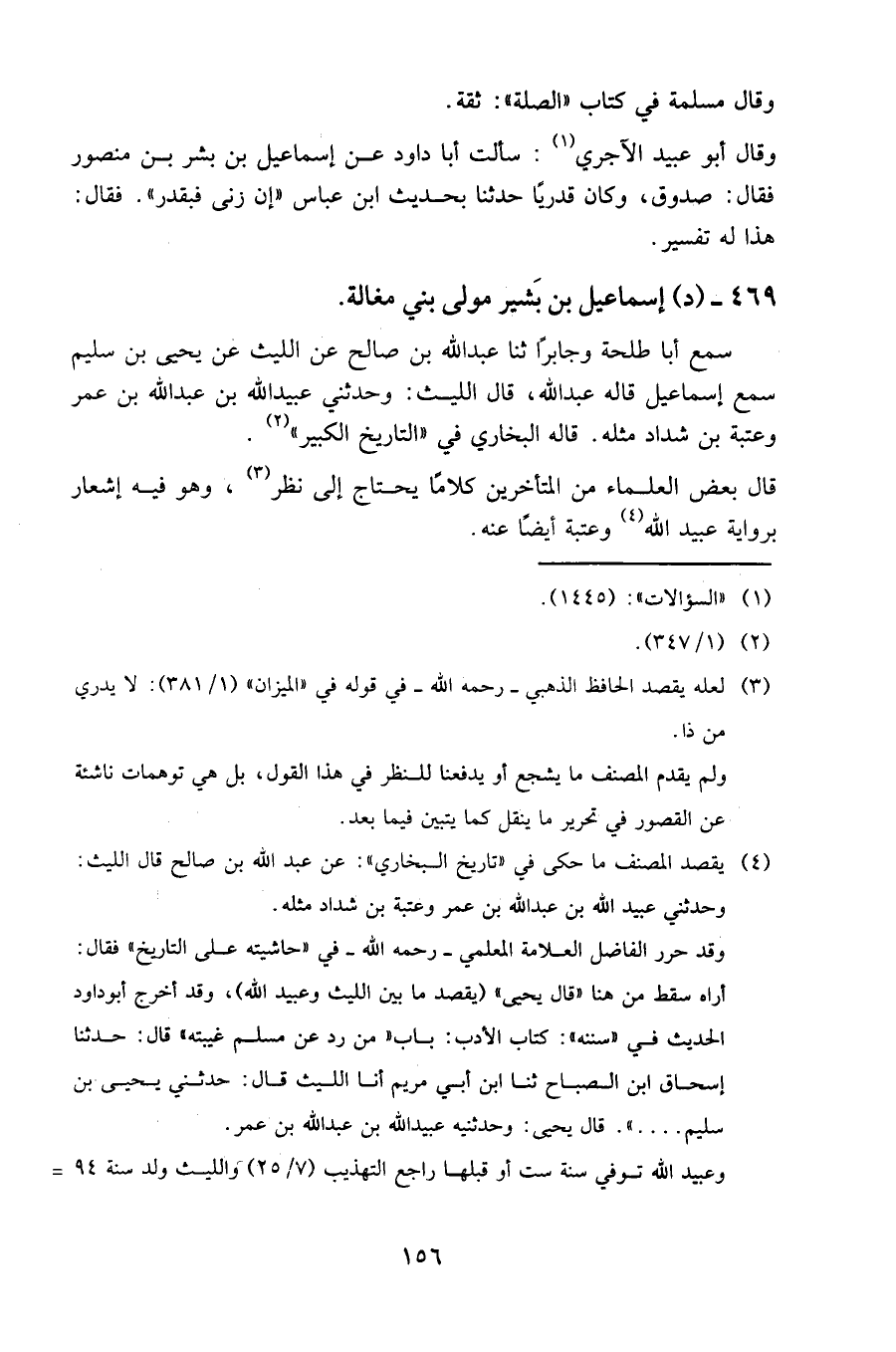 وقد حرر الفاضل العلامة المعلمي، رَحمه الله، في (حاشية على التاريخ) فقال: أراه سقط من هنا (قال يحيى) (يقصد ما بين الليث وعبيد الله)، وقد أخرج أبو داود الحديث في (سننه): كتاب الأدب: باب (من رد عن مسلم غيبته) قال: حدثنا إسحاق ابن الصباح حَدَّثنا ابن أبي مريم أنا الليث قال: حدثني يحيى بن سليم). قال يحيى: وحدثنيه عبيد الله بن عبد الله بن عمر.