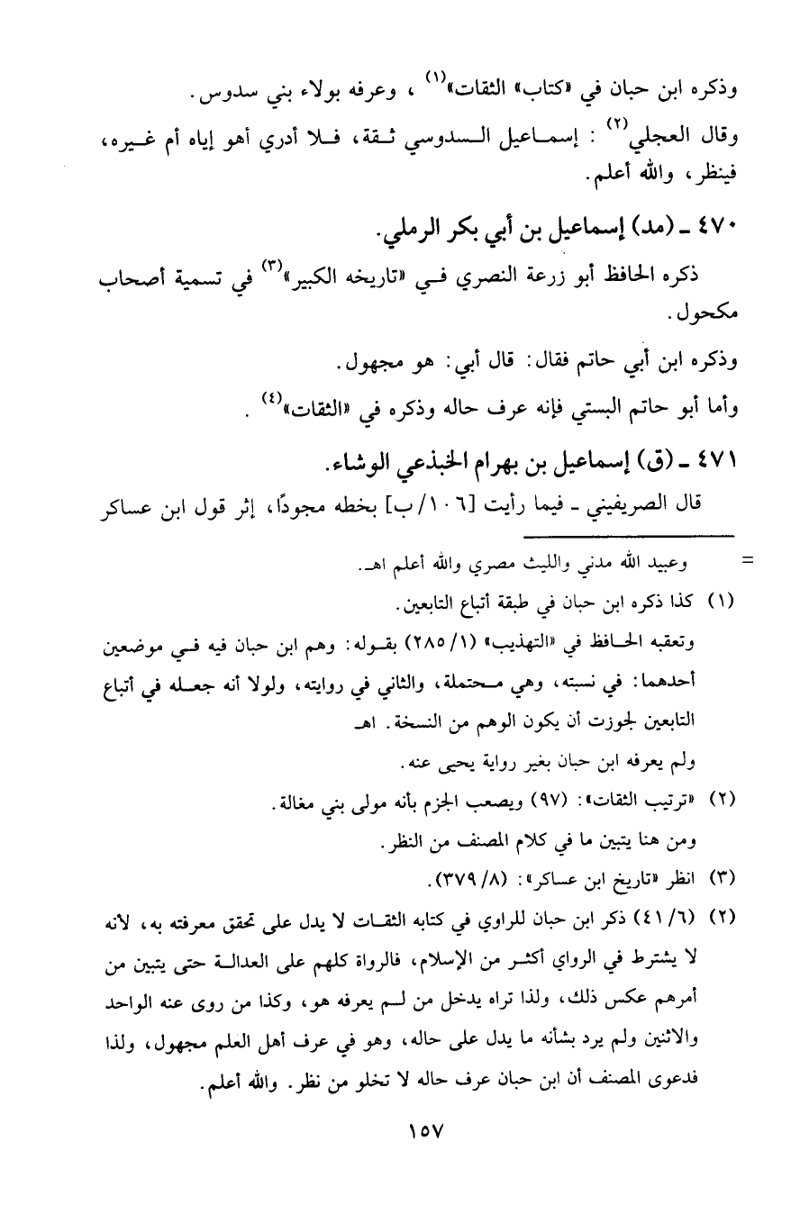 (4) (6/41) ذكر ابن حبان للراوي في كتابه الثقات لا يدل على تحقق معرفته به، لأنه لا يشترط في الراوي أكثر من الاسلام، فالرواة كلهم على العدالة حتى يتبين من أمرهم عكس ذلك، ولذا تراه يدخل من لم يعرفه هو، وكذا من روى عنه الواحد والاثنين ولم يرد بشأنه ما يدل على حاله، وهو في عرف أهل العلم مجهول، ولذا فدعوى المصنف أن ابن حبان عرف حاله لا تخلو من نظر، والله أعلم.