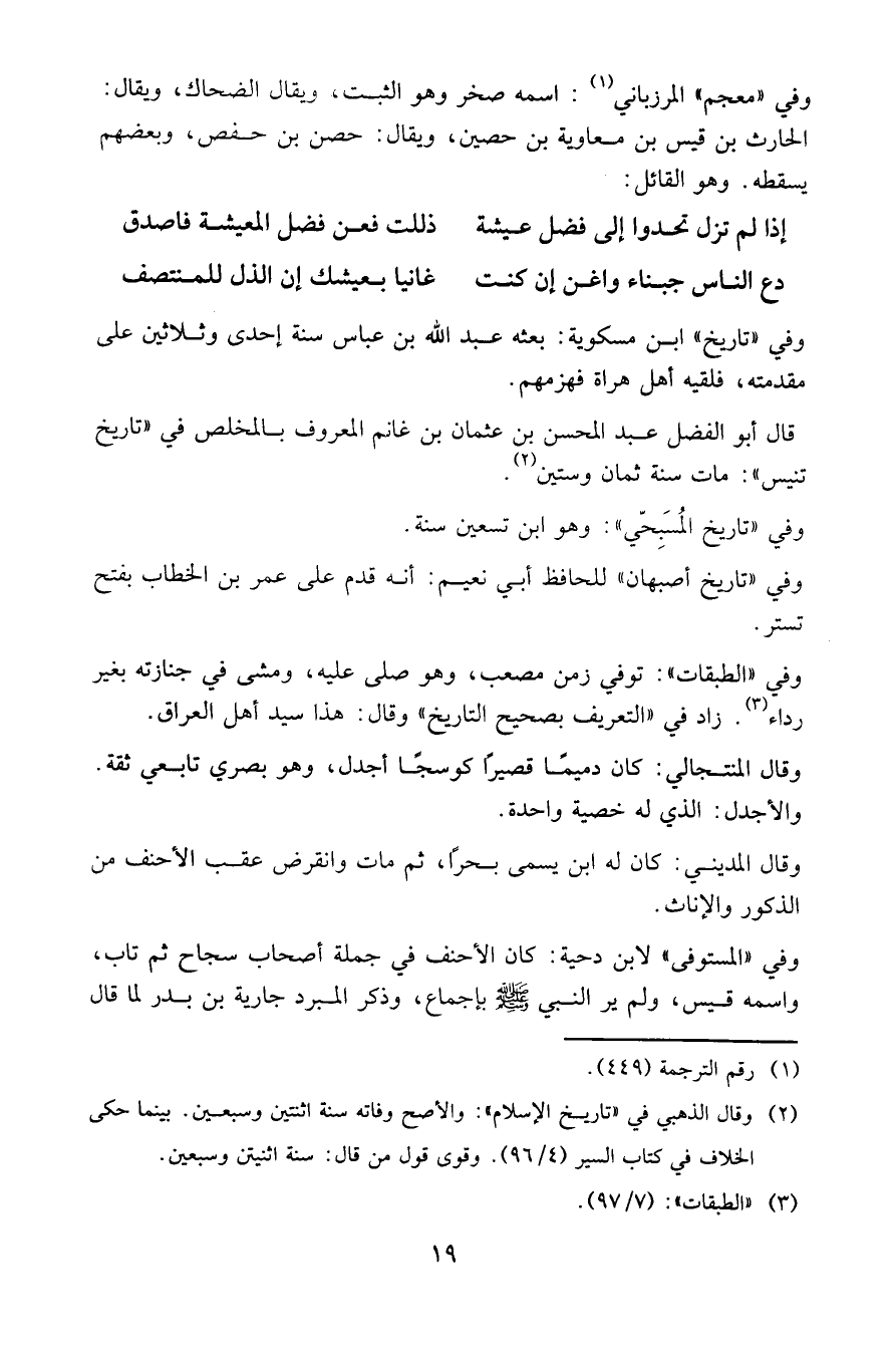 وفي المستوفى) لابن دحية: كان الأحنف في جملة أصحاب سجاح ثم تاب، واسمه قيس، ولم ير النبي صَلى الله علَيهِ وسَلَّم بإجماع.