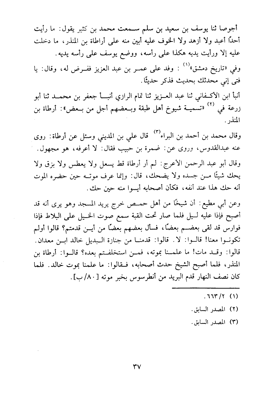 أنبأ ابن الأكفاني حَدَّثنا عبد العزيز حَدَّثنا تمام الرازي أنبأ جعفر بن محمد حَدَّثنا أبو زرعة في (2) (تسمية شيوخ أهل طبقة وبعضهم أجل من بعض): أرطاة بن المنذر.